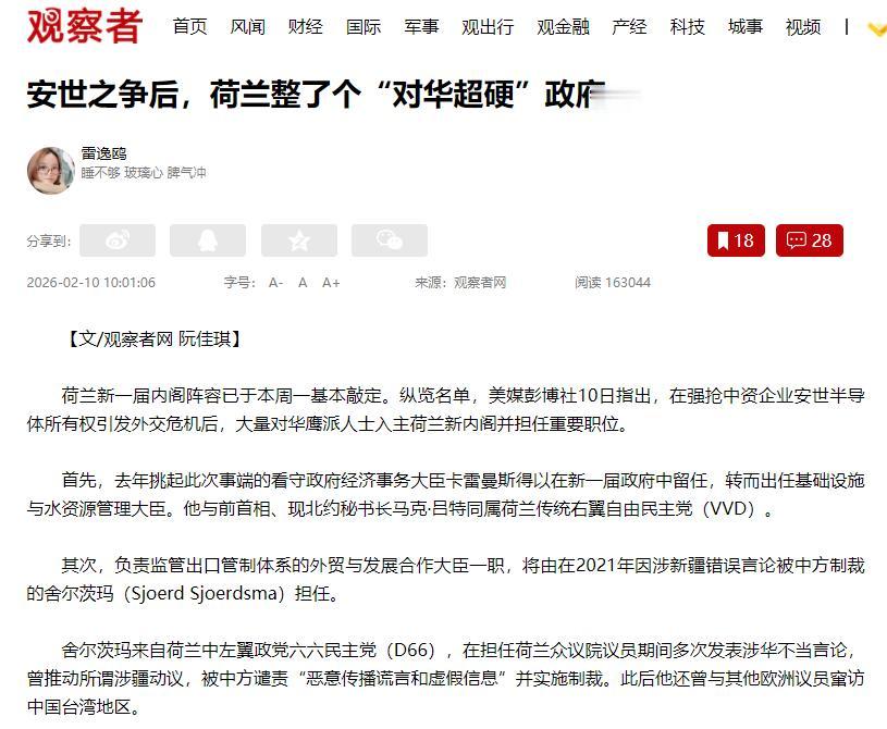 安世之争后,荷兰又准备对中国出手了! 荷兰新一届内阁,本周一已经基本定下来了。美媒彭博社10号报道说,之前荷兰要强抢中资的安世半导体,引发了外交矛盾,现在新内阁里,好多对中国态度强硬的人,都占据了重要职位。 这就意味着,荷兰很可能还会针对中国,出台不利于双方合作的政策,尤其是芯片领域,以后双方的摩擦大概率会更多。 先看看新内阁的核心成员配置,每个关键岗位都透着 “对华不友好” 的信号。 负责外贸和出口管制的大臣是舍尔茨玛,这人早在 2021 年就因为发表涉疆错误言论被中方制裁,之后还跟着其他欧洲议员窜访中国台湾地区,长期拿着虚假信息抹黑中国。 外交大臣由贝伦森担任,他总炒作中国在鹿特丹港的投资有 “威胁”,还支持欧盟无端调查比亚迪等中国企业,甚至主导起草过强调 “战略港口投资风险” 的报告,专门针对中国企业。 更让人警惕的是,去年主导干预安世半导体的卡雷曼斯,不仅没被追责,反而转任基础设施与水资源管理大臣继续留任。 负责数字经济的国务秘书威廉明・阿尔茨,长期炒作 “中国间谍活动”;国防部国务秘书德克・博斯维克更是直接说 “在对华依赖问题上,我们太过天真”,把 “中国威胁” 挂在嘴边。 这届内阁的执政协议里更是明说,要对中国采取 “果断行动”,理由是所谓 “打击窃取知识产权和不当干预关键基础设施”,完全是颠倒黑白。 这些人能扎堆进入内阁,和荷兰去年的政坛变动有关。 2025 年 6 月,极右翼政党退出执政联盟导致政府辞职,10 月提前举行大选,最终六六民主党、自由民主党、基督教民主联盟组建了少数派联合政府,38 岁的六六民主党党魁罗布・耶滕将成为荷兰史上最年轻首相,新内阁定于 2 月 23 日就职。 虽然这三党在议会 150 个席位中只占 66 席,需要争取反对党支持才能推行政策,但从人事安排和执政协议来看,对华强硬已经成了既定方向。 这一切都不是突然发生的,去年 9 月的安世半导体事件已经埋下伏笔。 安世半导体的前身是荷兰恩智浦的业务部门,2019 年被中国闻泰科技全资收购后,不仅还清了债务,还实现了技术升级,五年里给荷兰缴了约 1.3 亿欧元企业所得税。 但 2025 年 9 月 30 日,荷兰政府突然用 1952 年冷战时期的《物资供应法》,冻结了安世半导体在全球 30 个业务主体的资产和知识产权,还限制公司运营和人员调整,期限长达一年。 随后荷兰企业法庭接连作出裁决,暂停中方 CEO 的职务,把闻泰科技持有的股权交给第三方托管,实质就是抢夺中资对公司的控制权。 荷兰政府给出的理由是 “存在严重治理缺陷”“威胁欧洲技术安全”,但从头到尾没拿出任何具体证据。 其实背后根本是美国在施压,2025 年 9 月 29 日美国刚发布 “穿透规则”,规定被列入 “实体清单” 企业的子公司也会被连带制裁,而闻泰科技 2024 年底已经被列入该清单。 美国明确要求荷兰,必须更换安世半导体的中方 CEO、调整股权结构,否则就制裁安世,荷兰政府第二天就动手了,配合得十分 “默契”。 中方已经采取了反制措施,去年 10 月 4 日,中国商务部宣布禁止安世半导体在中国的子公司和分包商出口特定元器件。 要知道,安世半导体的营收里中国区占比高达 48%,这个禁令直接打在了它的供应链关键环节。 同时中方还加强了稀土出口管制,而稀土是半导体制造全链条都离不开的关键材料,这也让荷兰政府所谓的 “保障供应链安全” 成了笑话。 闻泰科技已经通过法律和外交途径维权,指出荷兰的做法违反了 2001 年中荷签署的投资保护协定,但荷兰方面至今没有撤销相关行政令。 卡雷曼斯在接受采访时甚至还说,再给一次机会依然会这么做,完全不顾及欧洲车企的担忧和全球产业链的稳定。 从现实利益来看,中荷其实深度绑定,中国是荷兰在欧盟外的第二大贸易伙伴,2024 年双边贸易额达 1100 亿美元,荷兰光刻机巨头阿斯麦三分之一的销售额都来自中国。 但新内阁显然更愿意跟着美国走,之前就已经在光刻机出口上对中国加码限制,2023 年禁止出售部分光刻机,2024 年又扩大了出口限制范围。 现在有了这些对华强硬派掌权,荷兰在芯片领域的对华限制大概率会进一步升级,可能会扩大出口管制的设备和零部件范围,也可能继续阻挠中资在荷兰的相关投资。 这不仅会损害中荷企业的利益,还会破坏全球半导体产业链的稳定。中方已经多次呼吁荷方纠正错误,但从新内阁的动向来看,后续双方的摩擦只会增多,中荷在科技和经贸领域的合作,将面临更多不确定性。