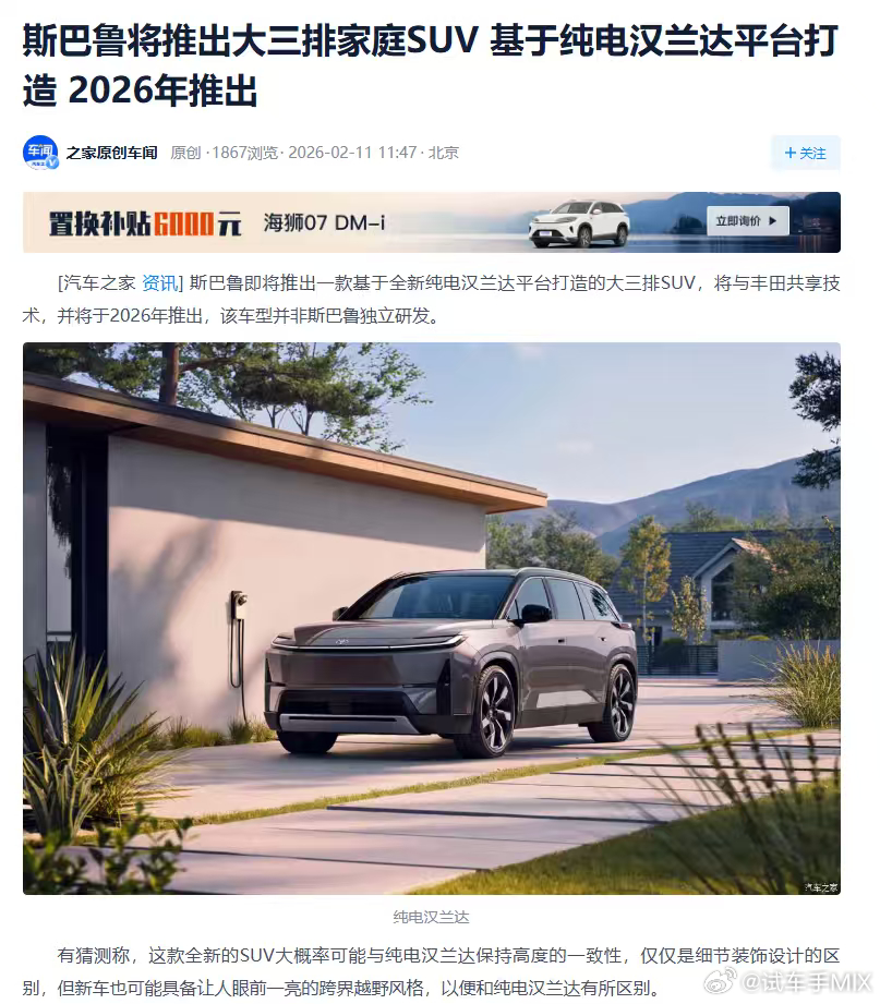 斯巴鲁与丰田的换装大赛?汉兰达转身一变,能给斯巴鲁提供配件?盲猜是叫Ascent EV?还是Solterra L期待五星战队的9系SUV初登场(不包含我们市场)