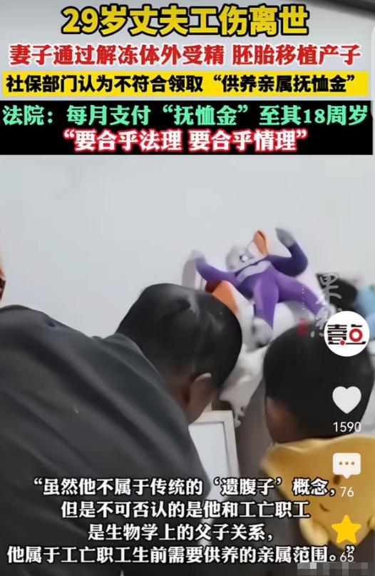 江苏淮安,一女子29岁的丈夫工伤离世,丈夫生前,夫妻俩在医院做试管,冷冻了胚胎,3天后就是做手术的日子,女子决定继续做手术,给丈夫留个后,孩子出生后,女子申请“供养亲属抚恤金,”却被拒绝,女子一纸诉状起诉到法院。法院判决出乎意料。 江苏淮安一名女子,原本和29岁的丈夫相守相伴,夫妻俩一直盼着能有一个属于自己的孩子,努力许久无果后,决定去医院做试管婴儿,历经波折,终于成功冷冻了胚胎,约定好三天后就进行胚胎移植手术,圆两人的育儿梦。 可天有不测风云,就在手术前三天,女子的丈夫突发工伤,经全力抢救无效不幸离世,突如其来的噩耗,将女子的世界彻底击碎。 悲痛过后,女子毅然决定,继续完成试管手术,拼尽全力给丈夫留个后,守住这个家最后的念想。 可等到孩子顺利出生,女子带着相关材料,去申请“供养亲属抚恤金”时,却被当场拒绝,走投无路之下,女子一纸诉状将相关部门起诉到法院,而最终的判决结果,出乎了所有人的预料。 经过多方打听和咨询,夫妻俩最终决定,去医院做试管婴儿,这是他们实现育儿梦的最后希望。从前期检查、促排,到取卵、受精, 每一步都走得格外艰难,女子承受着身体上的痛苦和心理上的压力,丈夫始终陪伴在她身边,细心照料、耐心安抚,陪着她一起熬过最难熬的日子。 功夫不负有心人,经过几个月的努力,医院成功培育出胚胎,并进行了冷冻,医生和夫妻俩约定,三天后就进行胚胎移植手术,只要手术顺利,女子就有希望怀上属于他们的孩子。 得知这个消息,夫妻俩欣喜若狂,满心期待着小生命的到来,开始默默规划着未来的生活,想象着孩子出生后的模样,一切都充满了希望。 可这份喜悦,仅仅持续了一天,就被一场突如其来的意外打破。事发当天,女子的丈夫像往常一样去上班,却在工作过程中发生意外,被紧急送往医院抢救。 女子得知消息后,瞬间慌了神,不顾一切地赶往医院,一路上,她不停地祈祷,希望丈夫能平安无事,可命运却格外残忍,经过医护人员的全力抢救,丈夫还是因为伤势过重,不幸离世,年仅29岁。 可每当想起冷冻的胚胎,想起夫妻俩未完成的育儿梦,想起丈夫生前期盼孩子的眼神,女子就重新燃起了希望。 她知道,这个胚胎,是她和丈夫爱情的结晶,是丈夫生命的延续,也是这个家最后的念想。于是,在悲痛过后,女子做出了一个坚定的决定。 按时去医院,完成胚胎移植手术,不管未来有多艰难,她都要把这个孩子生下来,给丈夫留个后,守住两人最后的牵挂。 好在手术很顺利,女子成功怀上了孩子。接下来的日子里,女子独自承受着怀孕的艰辛,一边思念着丈夫,一边小心翼翼地呵护着腹中的胎儿,平日里省吃俭用,克服了一个又一个困难,只为能让孩子平安出生。 孩子出生后,女子的生活越发艰难,独自抚养孩子,没有经济来源,连基本的生活都难以维持。这时,她想起丈夫是工伤离世,按照相关规定,未成年子女可以申请“供养亲属抚恤金”,以此缓解生活压力。 于是,女子整理好相关材料,带着孩子的出生证明、丈夫的工伤认定书等,前往相关部门申请抚恤金。 可让她万万没有想到的是,相关部门看完材料后,当场拒绝了她的申请。给出的理由是,全国尚无职工工亡后,遗孀通过解冻体外受精胚胎移植怀孕产子,享受供养亲属抚恤金待遇的先例,现行法规、政策也没有明确依据,因此无法为其办理。 看着被拒绝的申请,女子心里满是委屈和无助,她不明白,孩子明明是丈夫的亲生骨肉,是丈夫生命的延续,为什么不能享受应有的待遇。 为了给孩子一个保障,为了争取属于自己和孩子的合法权益,女子思来想去,最终决定拿起法律武器,一纸诉状将相关部门起诉到法院,期盼着法院能给出一个公正的判决。 法院审理后认为,相关抚恤金制度的立法目的,是救济工亡职工亲属的经济困难,孩子虽非传统意义上的遗腹子, 但与工亡丈夫存在生物学上的父子关系,属于丈夫生前需要供养的亲属范围,最终判决相关部门按月支付孩子“供养亲属抚恤金”,直至其年满18周岁。 如今,女子终于拿到了抚恤金,生活也有了基本的保障,她带着孩子,小心翼翼地生活着,把对丈夫的思念,都寄托在孩子身上,努力给孩子一个美好的未来。 对此,你们有什么看法,欢迎评论留言~