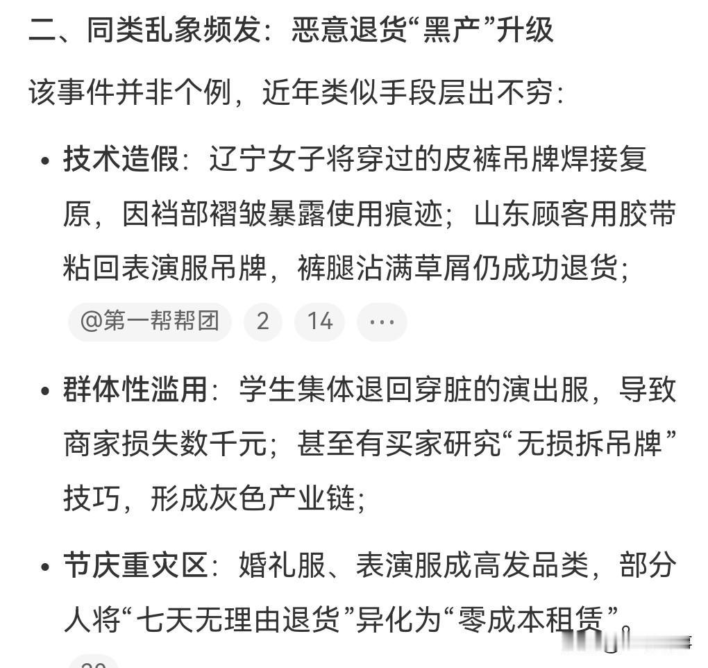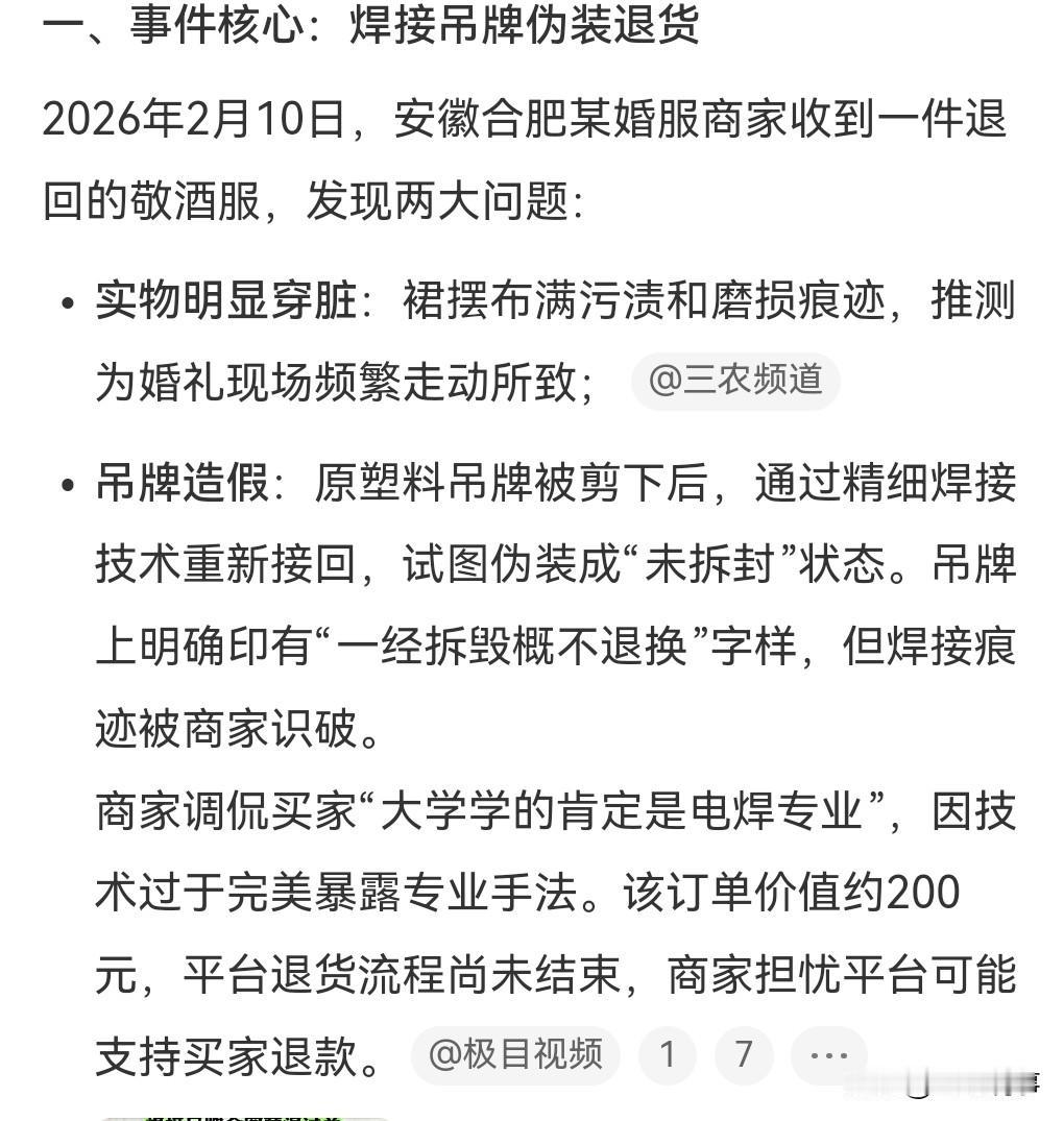这真是太缺德了,怎么那么喜欢占便宜呀。 把衣服穿脏了,然后又退回商家,这真的是让人很无语的一个事情。 2月10日,女子将敬酒服穿脏后焊接吊牌退货,店主很生气。 这女的可真有一手啊,竟然还焊接吊牌。 看来吊牌已经防不住这种薅羊毛的人了。 让商家担忧的是,平台可能会支持顾客退款,因为平台大多数是站在顾客这边的。 所以说这就是不公平啊。