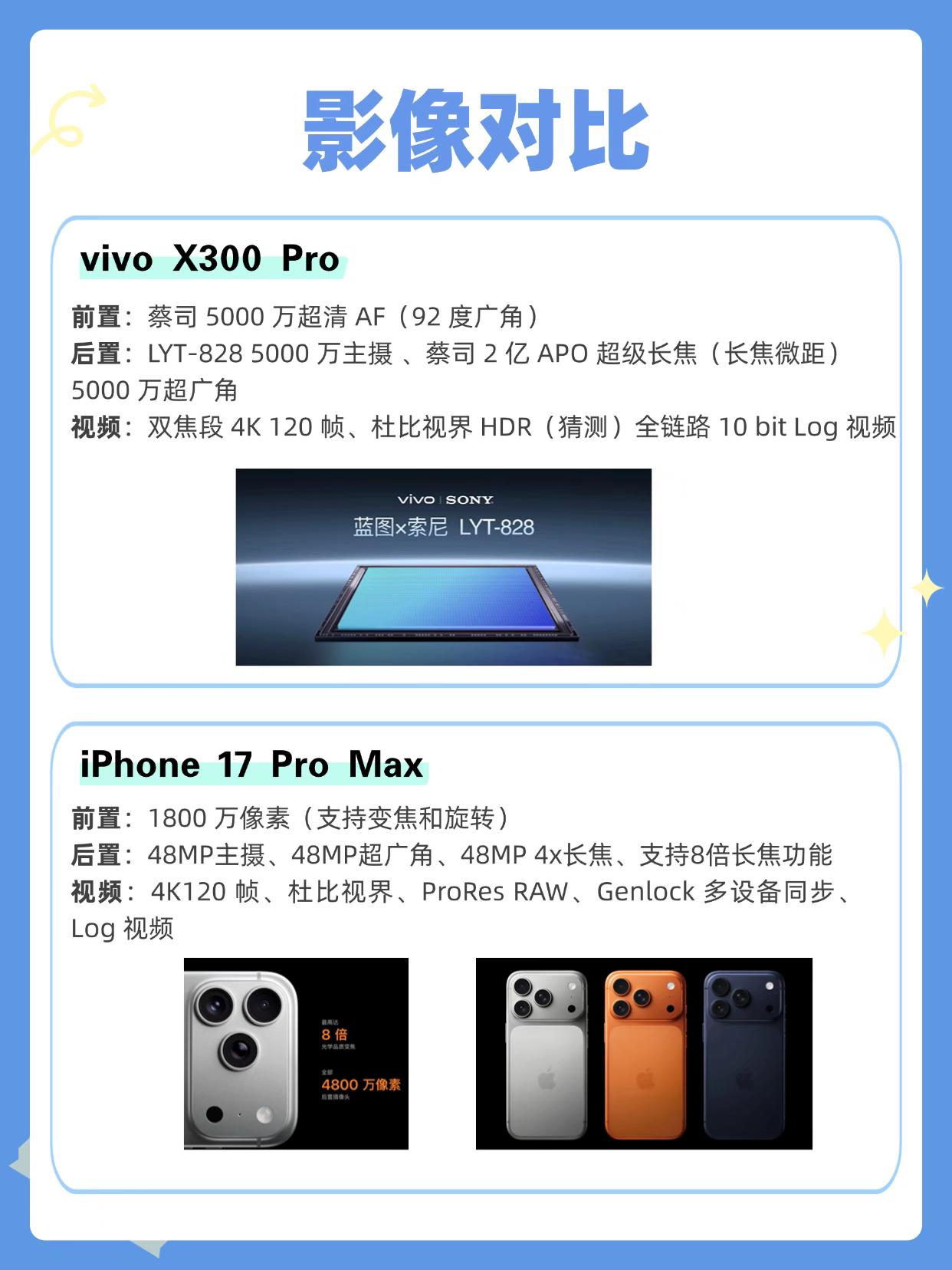 想买17 Pro Max和vivo X300 Pro,谁更值? 果子17 系列一发布,朋友圈直接被刷屏了!这次升级的屏幕和芯片确实不错,但看到 17 Pro Max 9999元起,还是忍不住觉得 “钱包压力有点大”。 刚刷到消息说vivo即将推出新品X300 Pro,浅浅研究了一下,发现很香 先看屏幕:护眼与颜值兼具 X300 Pro直接搭载果子同款的硬件级1nit低亮度屏幕,对经常深夜刷手机的人来说很友好! 而且蓝厂还给了双护眼方案,还是窄黑边设计,屏幕是真的不错 再看影像:配置拉满,拍照党狂喜 前置5000万像素AF摄像头; 后置5000万像素云台级主摄+ 2亿潜望长焦+5000万超广角 感觉比果子的强不少啊 性能补充:流畅能打,细节贴心 天玑9500处理器,跑分超过400万,目前首款达成这个跑分成绩的旗舰机 另外还有自研信号芯片组,甚至支持卫星通讯,整体堆料确实很足 离谱的是,机身厚度应该会控制在 7.99 毫米 给大家一个小建议 如果追求全能影像和高性能,完全可以等等 vivo X300 Pro 但如果是iOS系统刚需用户,那17 Pro Max还是更适配; 至于想找 “苹替” 的朋友,蹲 X300系列大概率不会失望~ 手机推荐iPhone17ProMax 科技改变生活 手机推荐