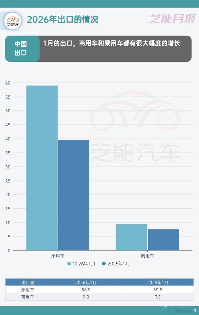 26年1 月汽车出口数据出炉,整体依旧保持高增长,新能源更是实现翻倍增长,占比接近一半,纯电、插混双双强势,早已成为出口核心增长源,和三年前燃油车为主的结构截然不同。