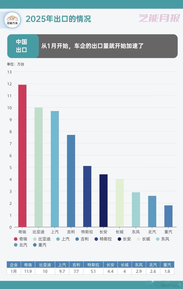 出口车企格局也在重塑,奇瑞、比亚迪、上汽位居前列,吉利增速亮眼,中国品牌成为绝对主力,外资品牌占比有限。