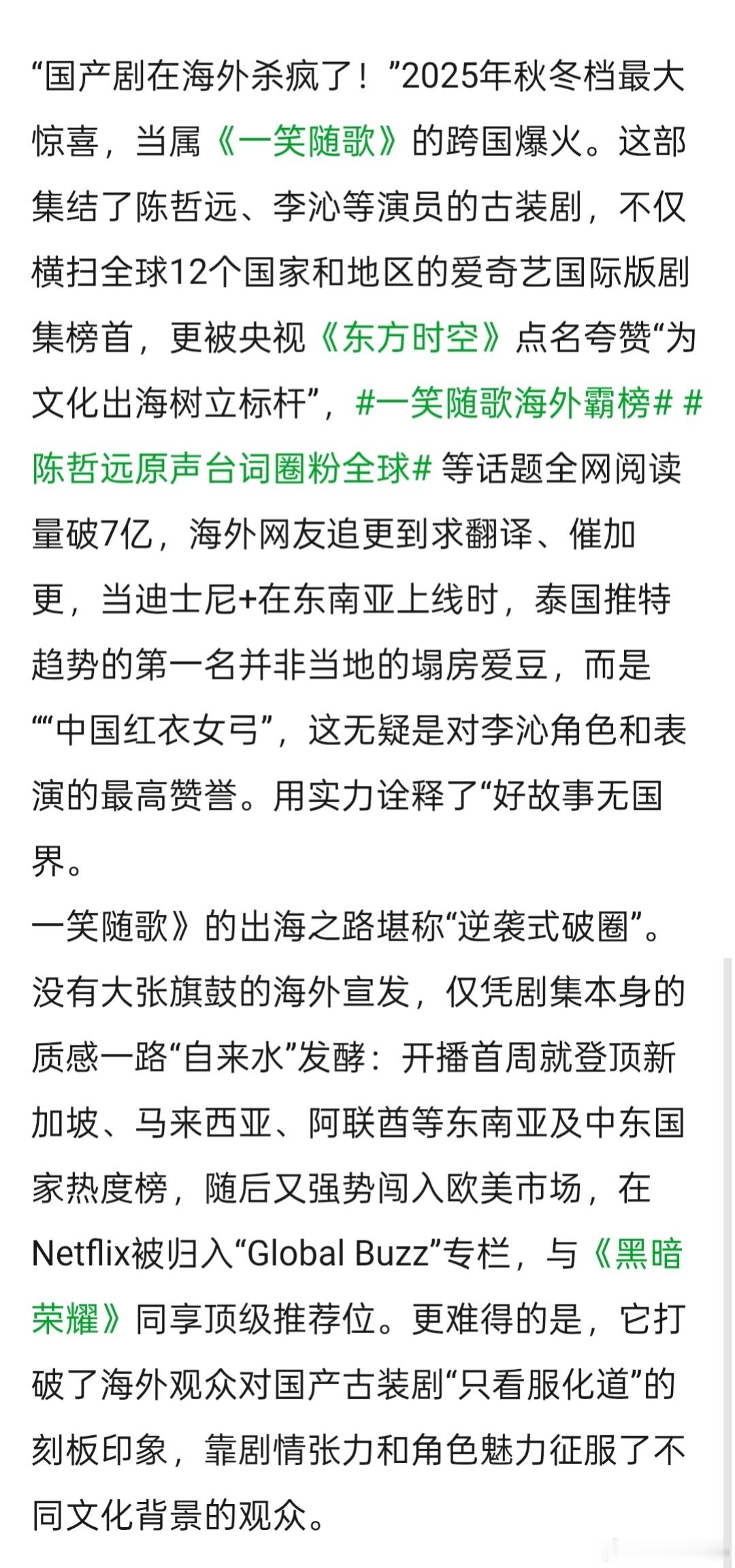 一笑随歌与黑暗荣耀国外共享顶级推荐位,央视新闻频道和财经频道在《文化“新三样”海外市场“热”起来》专题报道中,特别点名《一笑随歌》🥝签陈哲远确实是签对了