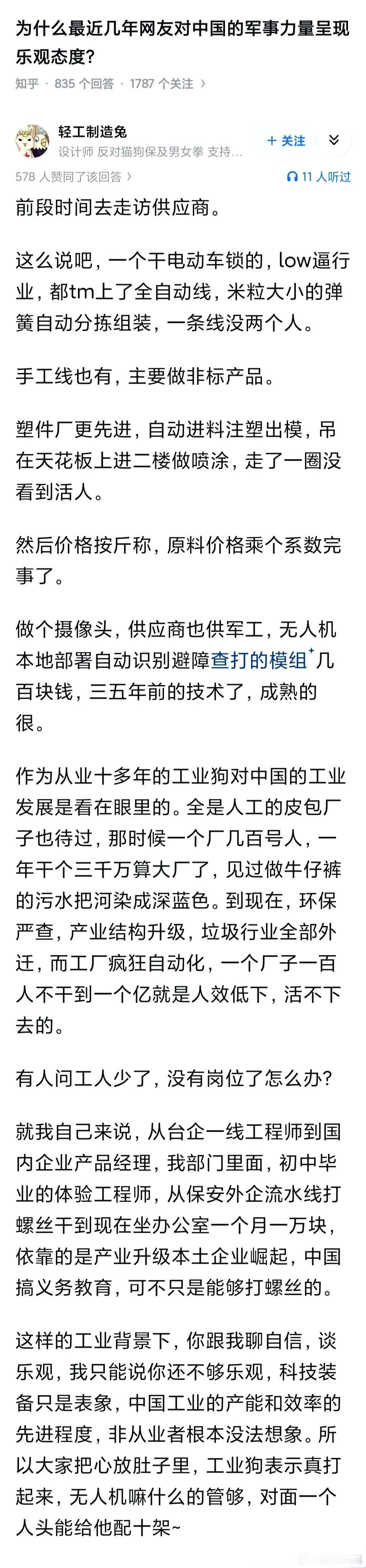 大家为什么对中国军事乐观?因为很多产业链真的水到渠成,自然而然的地步。国内一些有创意的企业,创造产品很快民转军,因为实在太先进,吊打国外一切。而且,只要想法创新程度不超过产业链可以达到地步,很快就可以早出来。