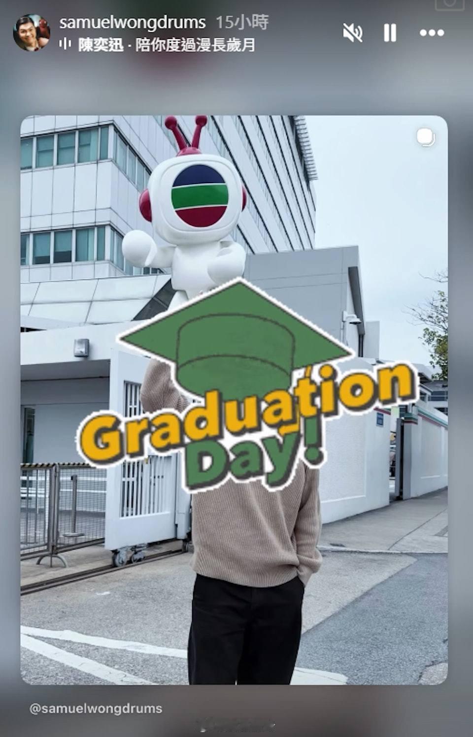 黃潤成在IG Story載發「畢業照」,並寫道:「又完成左一段喜怒哀樂既里程碑。感恩這8年在電視台磨練倒點同鏡頭做朋友、感恩能在訓練班承師戲劇教授羅冠蘭老師,但最大嘅收穫都係認識到呢位真兄弟陳建文👊🏻雖然這些年未能盡顯小弟既戲劇才華, 但我仍會喺其他不同領域繼續展現我的光😎。」他隨後介紹自己的室內裝飾設計工作室及流行鼓教學,並自信強調對產品質素的執著「會嚇親你」,最後以「保重,江湖見」向幕前幕後道別。