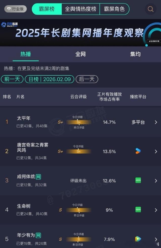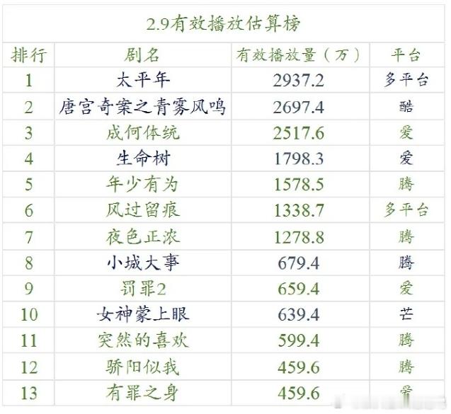在播剧又整体完蛋了!《成何体统》一开始还不错,涨势很明显,但是现在还没播过白鹿的《唐宫奇案》,白鹿的《唐宫》热度已破万,但优酷破万含金量不高,其他平台热度破万播放量最低也是《骄阳似我》的3800万,但是《唐宫》破万只有2000多万,白宇的《太平年》依旧在榜首,杨紫《生命树》播放量一天比一天低,这个档期又完蛋了。