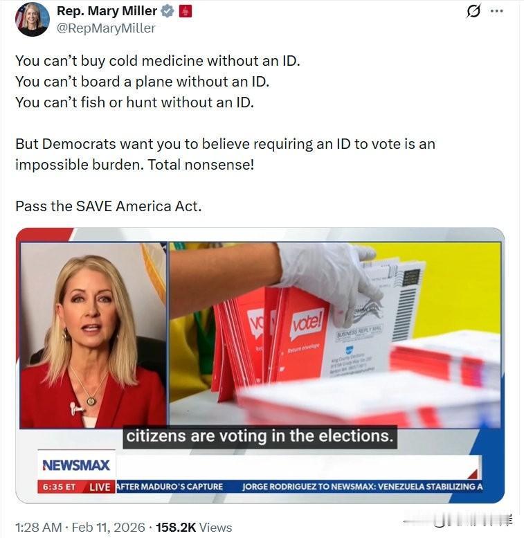众议员Mary Miller发文为《拯救美国法案》拉票。 “你买感冒药需要身份证。 你登机需要身份证。 你钓鱼或打猎需要身份证。 但民主党人想让你相信,投票时要求出示身份证是一个"无法承受的负担"。 完全是胡说八道! 通过《拯救美国法案》(SAVE America Act)。”