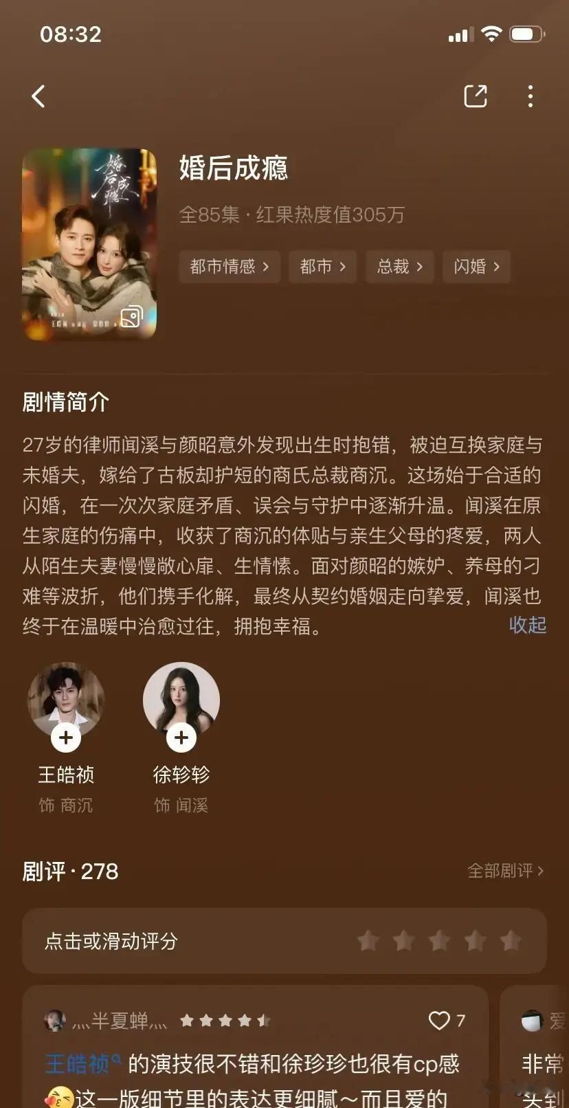 刷到《婚后成瘾》上线抖音,点进去一看,女主是王皓祯。 短剧里她演闪婚女霸总,三分钟一集,剧情像火箭,吻戏、误会、追妻一气呵成。 弹幕都在刷她眼神带杀气,连西装都穿出刀感。 我连着刷十集,发现她台词节奏稳,情绪切换快,确实比同批短剧演员多几分狠劲。 平台数据也猛,上线三天就冲到热度榜十二,虽然后劲一般,但首波流量吃到了。 短剧拼的就是第一眼吸引力。 王皓祯这次抓住了机会,把角色立住了。