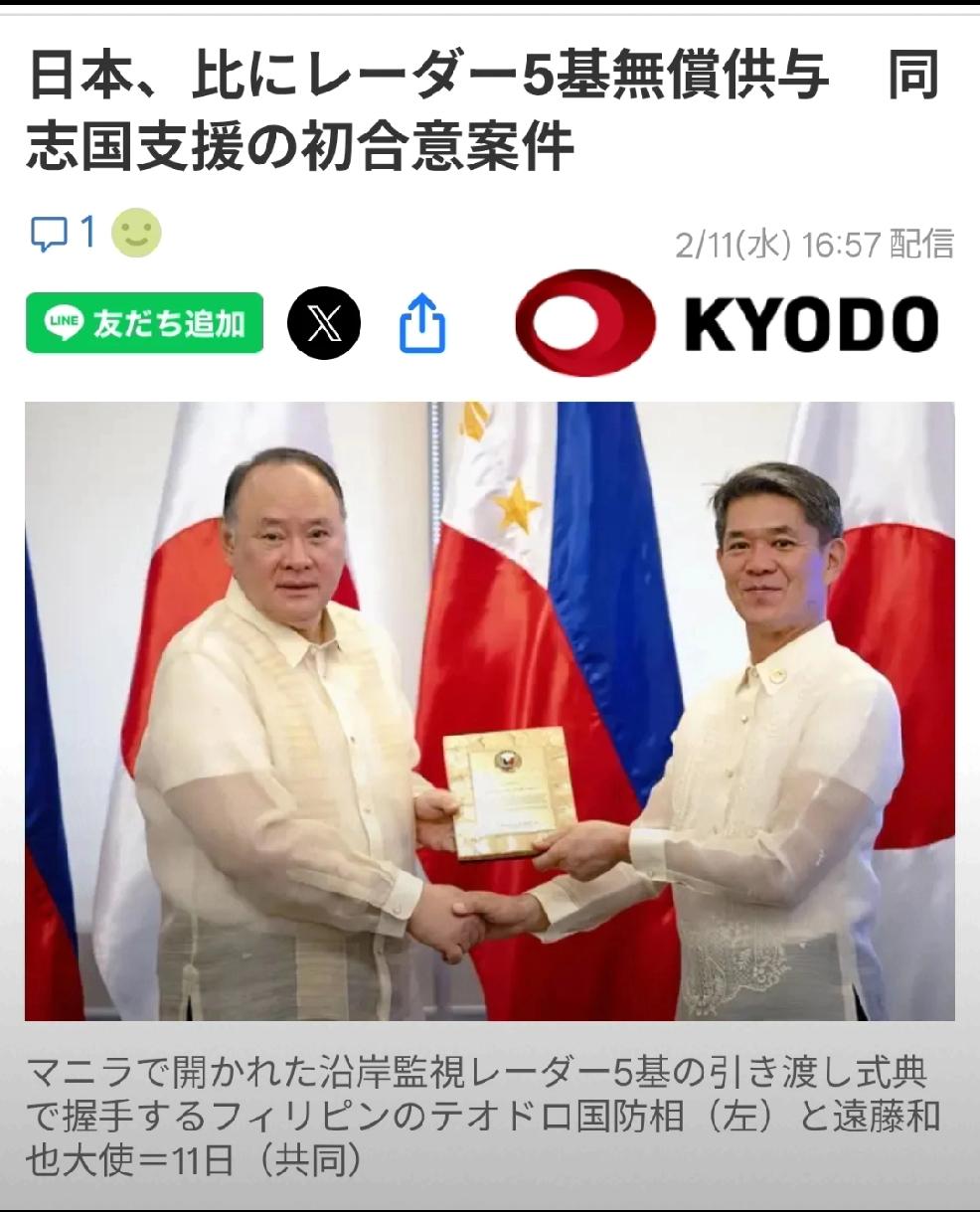 2月11日,日本共同社发文:日本决定无偿向菲律宾提供的5台沿海监视雷达的交接仪式于11日在马尼拉的菲律宾军事基地举行。 这五套总价值六亿日元(约2700万人民币),基于2023年日本与菲律宾达成的协议,当时日本建立了政府安全保障能力强化支援框架,以支持对方国家的武装力量。 个人认为:听那些台上的日本表演型政客,漫天谎话,话术一套一套的演讲,为那些炮灰日本人而感到悲哀,因为这完全就是以口嗨为主,不顾民生经济问题,只为自己升官发财而操劳用心。 那些日本政客嘴上说着“不要战争,不要伤害,要求同存异,要开放对话”,这些话恐怕他们自己都不相信。 可实际上,自己的所作所为又是什么?无偿免费给邻国武器装备,为的是日后与其结伴,一起合伙干预中国内政,威胁中国。同时,不忘嘴上宣传,这又是中国威胁导致的。 日本人的这一套“日式逻辑”,真是荒诞离奇而又无比现实。