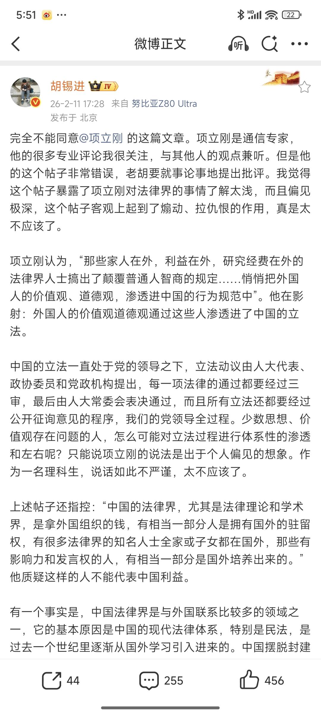 胡锡进怒斥项立刚的清理法律界的主张,指出项立刚对法律界的认知浅薄且充满偏见。认为其帖子在客观上起到了煽动对立、制造仇恨的效果,让人感到不安。 2月11日中午,项立刚发表一篇《中国的法律界到了必须清理的时候了》的文章,一共3个重点: 1. 项立刚认为中国法律界到了必须清理的时候,法律作为社会行为规范,其制定者必须代表中国利益。 2.长期以来,中国法律界,尤其是法律理论和学术界,存在大量人员接受外国组织资助、拥有国外居留权、家人或子女定居国外,而且很多有影响力的人士是由国外培养的。 3.中国法律界,很多人无法代表中国利益,其制定的法律规范会渗透外国的价值观和道德观,导致普通人无法理解的判决和规定。 2月11日,晚上胡锡进针对这篇文章,提出了自己的看法:他认为项立刚观点存在严重错误, 胡锡进反对的地方是,中国的立法过程始终在党的领导下,遵循严格的法定程序,少数人不可能系统性地渗透或左右立法,项立刚的说法是基于偏见的想象。中国现代法律体系本身就是在借鉴国外经验的基础上发展起来的,中外法律合作多为平等互利。项立刚将法律界人士简单标签化为“拿外国钱、代表外国利益”,是一种粗暴且不负责任的总结。 大量有海外或留学经历的法学专家,如梁慧星、张明楷等,都为中国法治建设做出了重要贡献。用“出身论”搞身份政治,不仅有害于中国法治建设,也不利于中国在全球化中发挥作用。 胡锡进认为“清理”一词极具煽动性,这种主张会破坏内部团结,削弱中国社会的对外张力,本质上是一种反智和非理性的民粹主义表达。 我支持胡锡进的看法,不赞同对留学生群体的攻击和污名化,不管文理,中国与外部的交流应得到充分的理解和尊重。大家觉得呢?