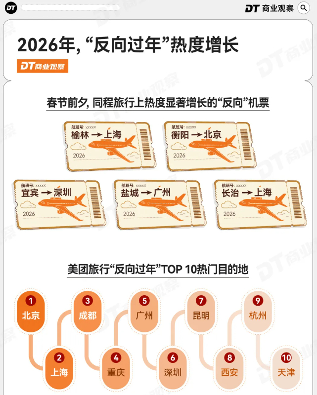 同程旅行《2026年春节旅行趋势报告》显示,春节前夕,一批由中小机场飞往北京、上海、广州、深圳的“反向”机票预订热度增长显著,热门航线主要包括榆林-上海、衡阳-北京、宜宾-深圳、盐城-广州、长治-上海等。