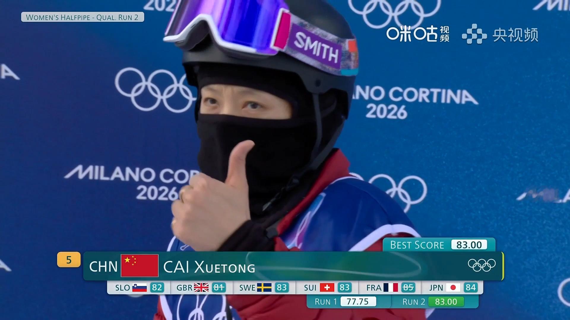 米兰冬奥会单板滑雪女子U型场地技巧预赛,中国选手蔡雪桐排名第5晋级决赛,另一位中