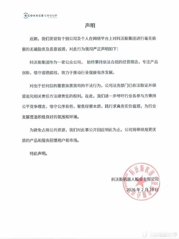 科沃斯发声明:个别公司及个人毫无依据无端指责及恶意诋毁