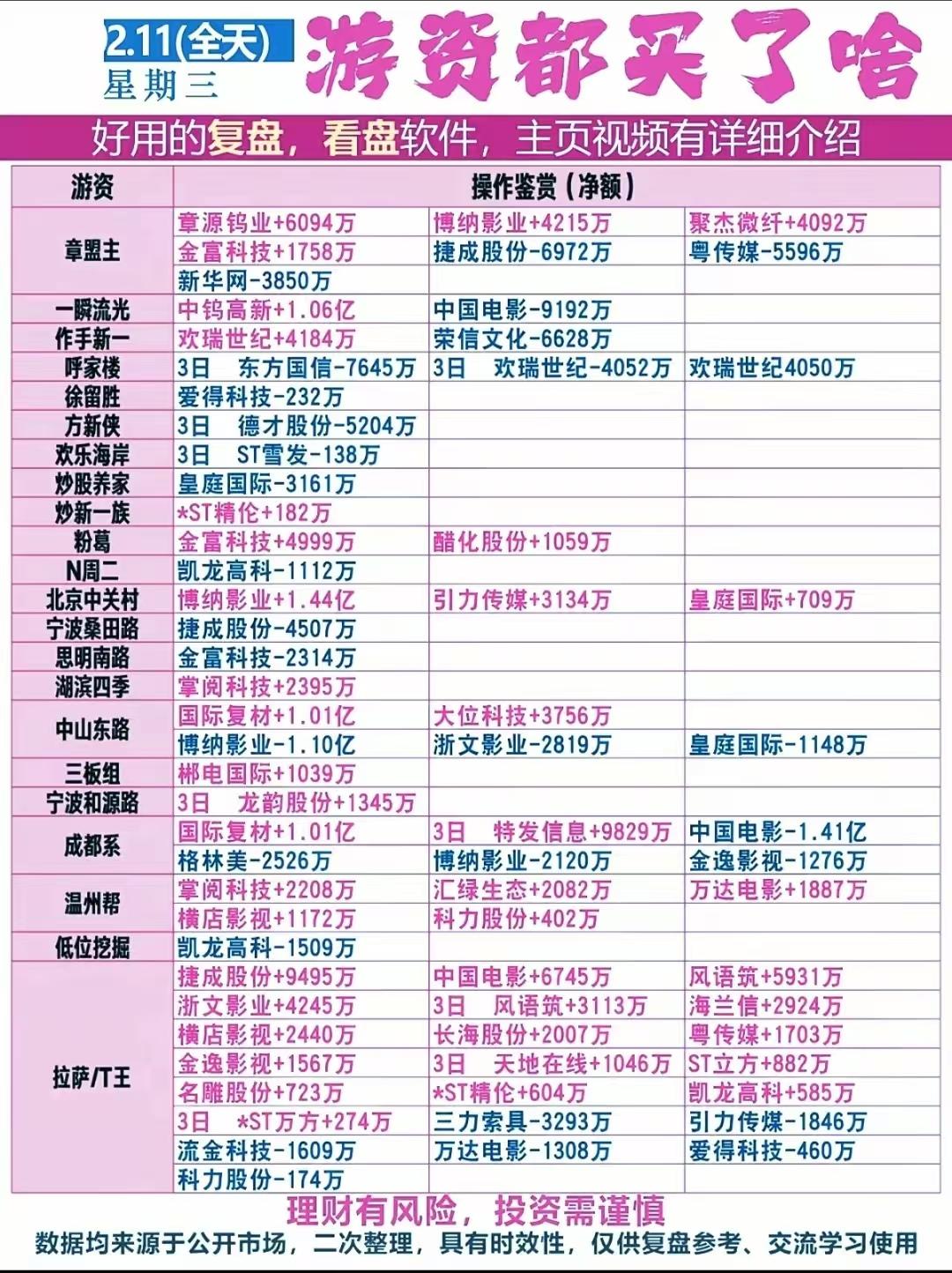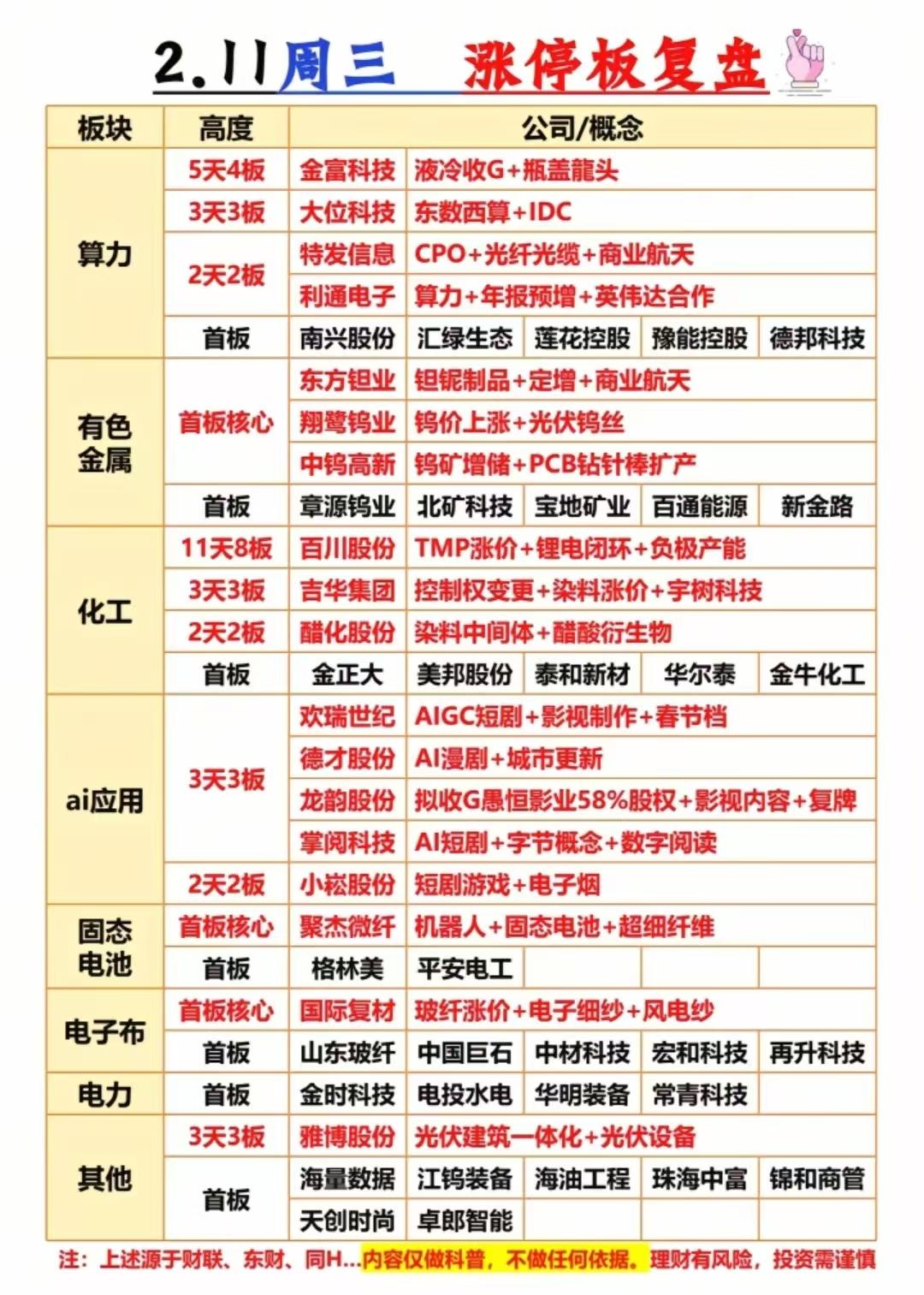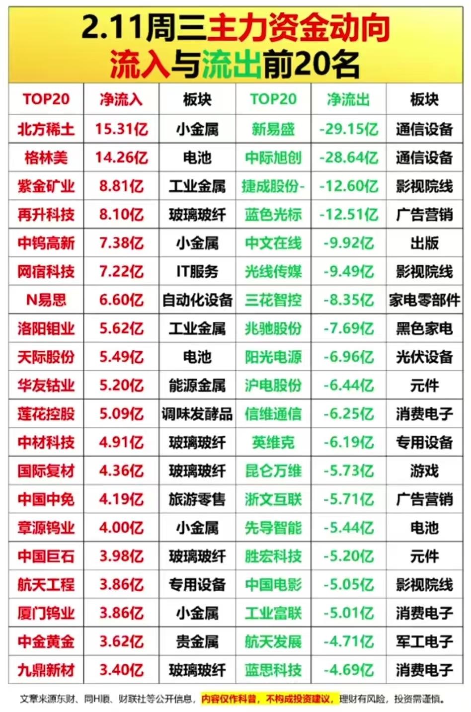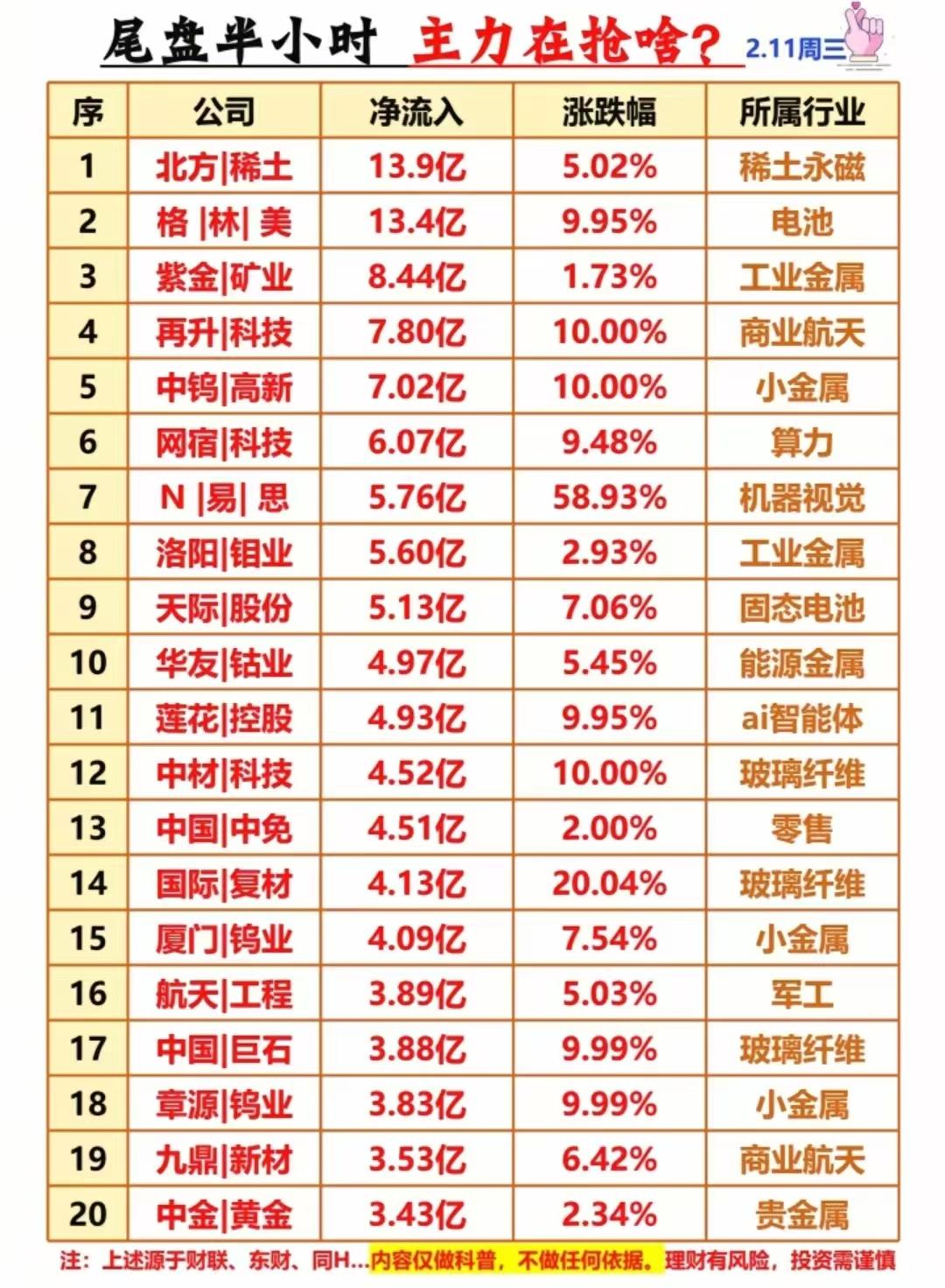 2月11日周三A股涨停+主力资金复盘:三大主线狂飙,尾盘抢筹名单曝光! 2月11日A股三大主线火力全开:算力板块金富科技5天4板、大位科技3连板;有色金属钨钼稀土集体爆发,中钨高新、章源钨业等多股涨停;AI应用与化工板块也强势连板,市场情绪持续升温。 主力资金方面,全天净流入TOP20被小金属、电池、玻纤板块霸榜,北方稀土、格林美、紫金矿业吸金超8亿;通信设备、影视院线板块则遭大幅流出,新易盛单日净流出近30亿。 ⚠️注:以上内容仅作复盘科普,不构成投资建议,理财有风险,投资需谨慎。主力抢筹、游资买卖数据等等都不能代表股价趋势,不能作为投资依据,理财有风险入市需谨慎!