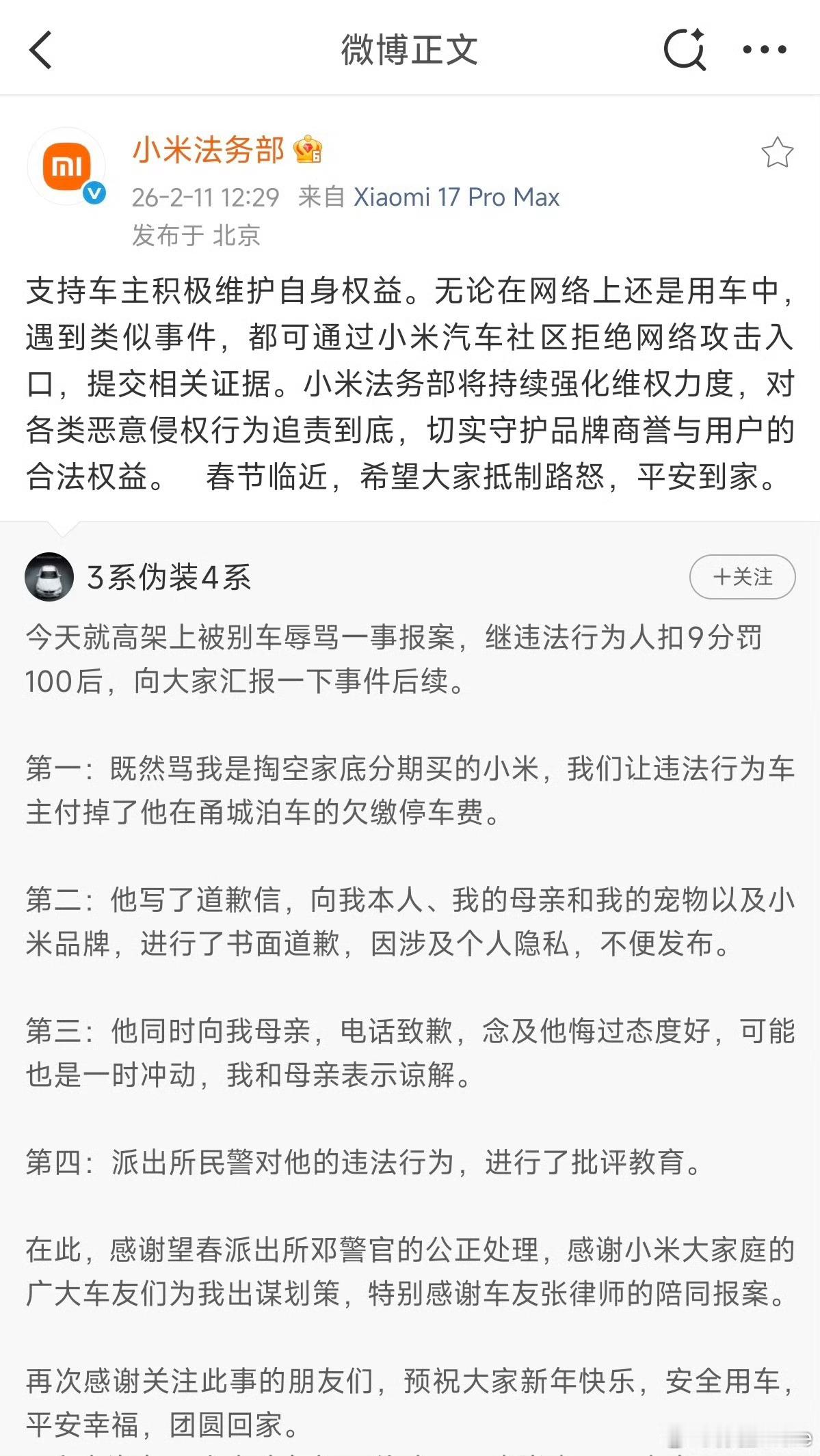 小米为被别车辱骂车主发声挺好的,我作为小米车主,看到品牌为遭遇恶意别车、被言语辱骂的车主站出来发声,全力支持合法维权,心里特别踏实。这不仅是维护一位用户的权益,更是守护每一位车主的尊严与安全感。