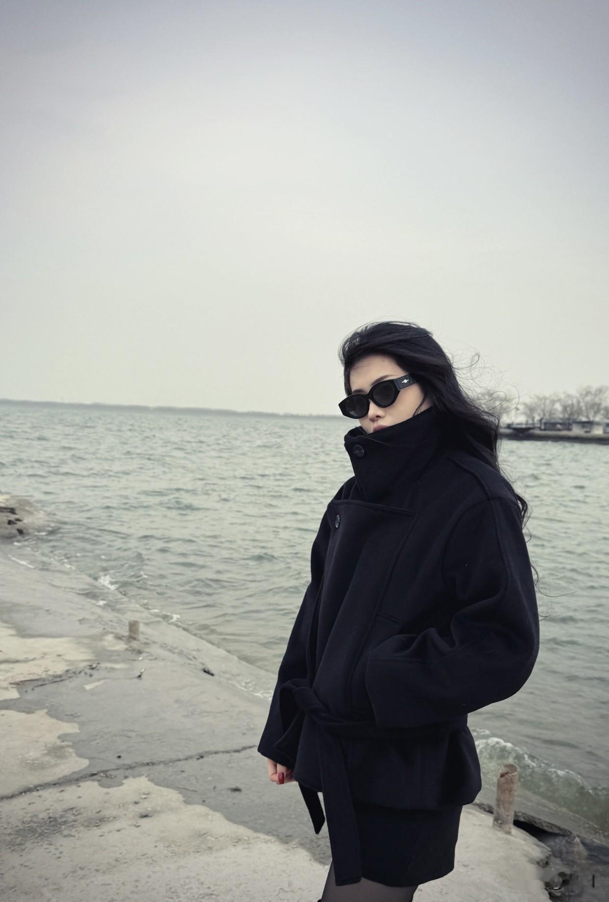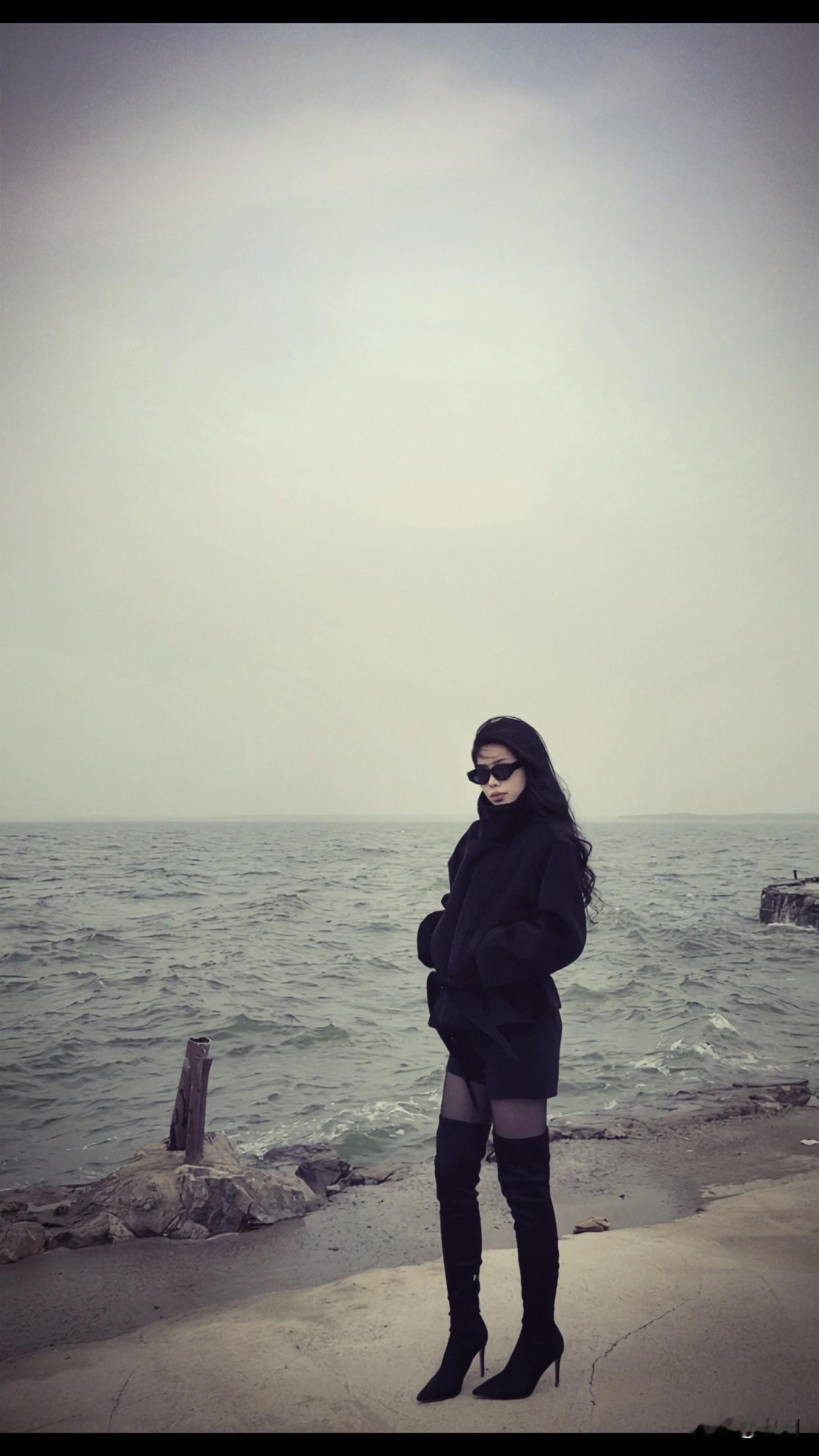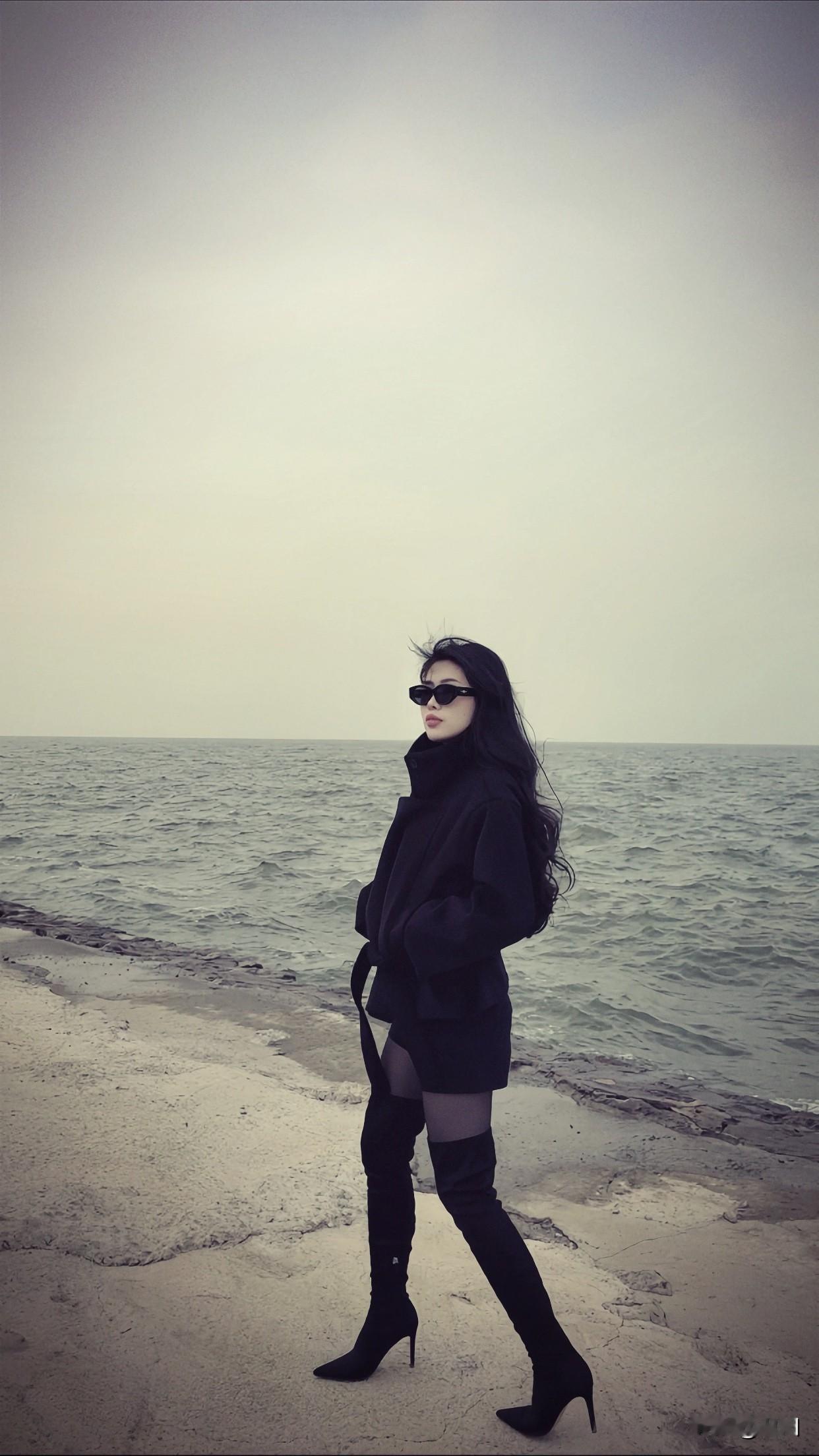 分享唯美的美照海边漫步,黑色外套与长靴的时尚搭配,尽显酷炫风格。