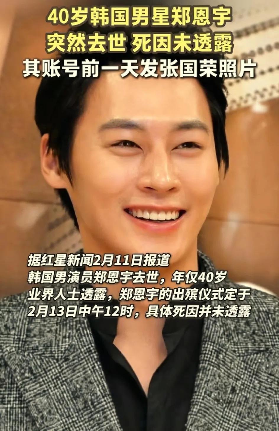 演员郑恩宇突然去世!据2月11日报道:郑恩宇前一天还在更新动态,隔天离世死因未披露。去世前一天缅怀张国荣。留下六字遗言:羡慕,遗憾,思念。他的追悼会将于2月13日举行。郑恩宇今年才40岁,真的十分令人惋惜。张国荣是他崇拜的男星,愿他们在天国相聚。