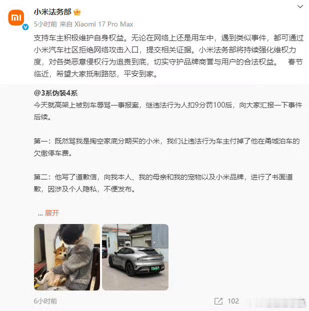 小米为被别车辱骂车主发声小米车主遭特斯拉车主别车辱骂就在今天,我米法务部转载曝光一起春节前路怒事件,浙江一我米车主正常变道,遭黑色TSL司机恶意别车、持续辱骂,内容涉及对车主及品牌的不当言论,车主冷静取证报警后,TSL司机因危险驾驶被扣9分、罚款100元,还写下书面道歉信向车主、车主母亲、宠物及品牌道歉,因隐私未公开。