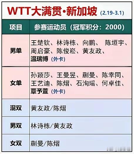 新加坡大满贯马上开打, 女乒依旧稳定, 但是男乒除了王楚钦, 谁能和他一起守半区? 林诗栋? 最近石头正是低谷期, 很难有好的状态! 周启豪? 刚刚拿到了多哈球星挑战赛冠军, 手感正旺, 打赢了大登,奥恰等名将, 有可能打进决赛! 温瑞博? 冲劲更猛, 西亚两站, 打赢了林德,雨果,达科,杜达,弗朗西斯卡, 这次也有可能冲进决赛! 你觉得还有谁能和大头一起守本区?