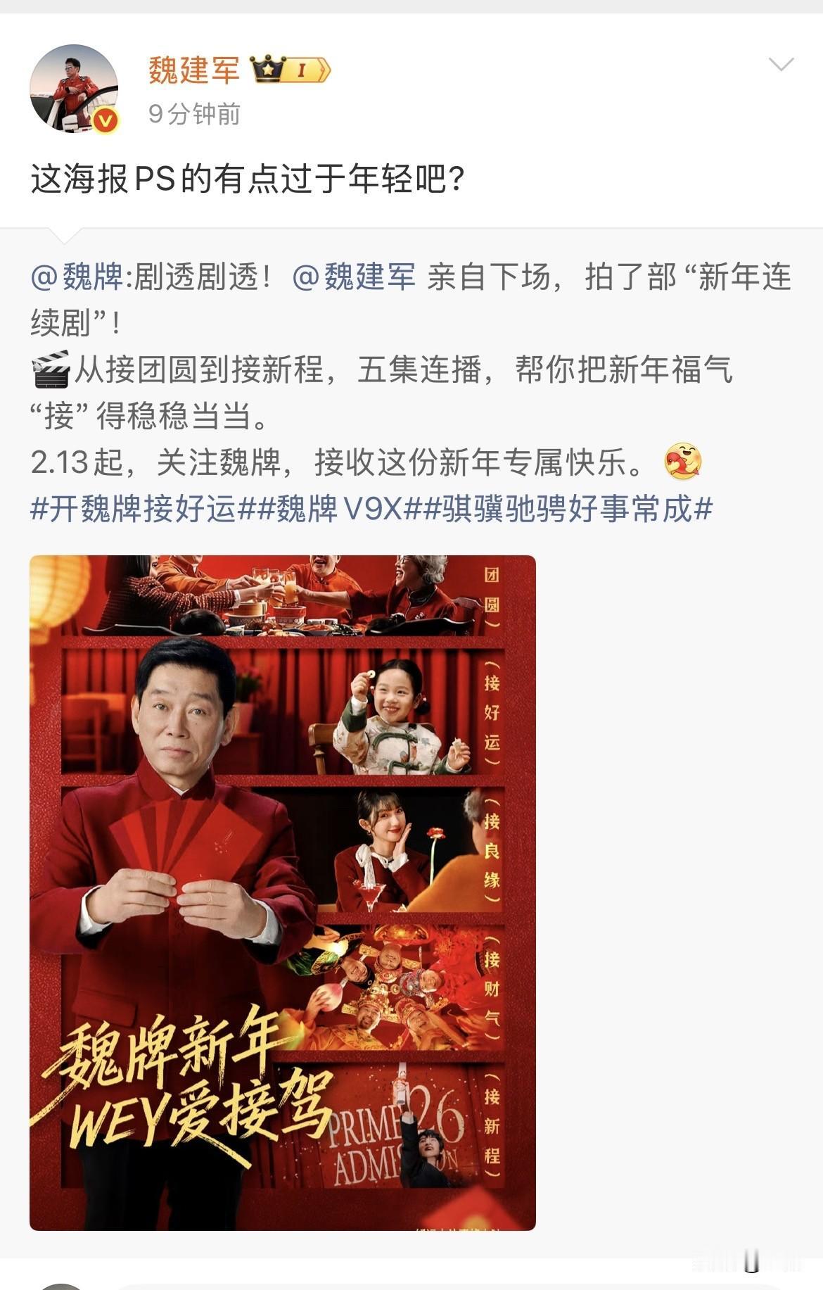 魏建军:这海报PS的有点过于年轻吧[捂脸] 今天晚上 ,魏牌汽车搞了一个主题宣传海报,是关于新年接驾的,其中一些片段魏建军本人也参与拍摄,所以今天晚上当官方把主题海报发出来的时候,魏建军也很自然地转发了。 不过他写的文字很有意思,他认为小编在做这个海报编排的时候,把他PS的过于年轻了,看来他还是比较在乎自己的形象,而且不是大家认为的要拍的年轻帅气,反而相反,他喜欢自己在镜头上面有生活中看起来差不多,不要给观众太多落差的感觉,追求客观事实,对于一个60岁的人来说也是比较重要的! 很明显,他是懂得这一点的,所以他就专门问大家这个照片是不是把它PS的过于年轻了,很多人认为还好 ,没有刻意把他年轻化,看来大家也是懂得人情世故的[捂脸]