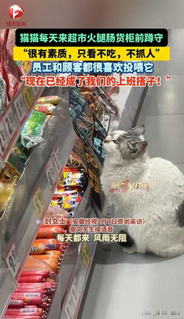 江苏连云港,一只猫每天在超市火腿肠货柜前蹲守。没想到,它只看不吃,到饭点会回家吃饭,吃完再来守着,获得员工和顾客投喂。 在江苏连云港的一家超市里,如果不仔细看,你可能会以为那个灰白色的身影是一尊毛绒摆件。 这并非夸张。 在人来人往的嘈杂环境中,这只猫展现出了一种与周围环境格格不入的定力。它的坐标被精确锁定在火腿肠货柜区,不偏不倚,仿佛那里有一条看不见的红线将它与剩下的世界隔绝开来。 这不是一次偶然的路过,而是一场蓄谋已久的“狩猎”。更有意思的是,这场狩猎完全静音。它蹲坐在那里,眼神在货架底层和高层之间来回扫描,那种专注度,像极了在博物馆里鉴赏名画的老学究。面对琳琅满目的肉制品,它没有伸出爪子,没有跳上货架,甚至连一声急切的喵叫都没有。 它只是看。眼巴巴地看。这种近乎苦行僧般的克制,在某种程度上击中了人类的软肋。按照常理,猫是机会主义者,看见食物本该直接掠夺。但这只猫似乎参透了更高阶的生存法则:抢夺不仅风险高,而且是一次性博弈。而“守候”虽然见效慢,却能换来源源不断的长期收益。 这种“非暴力不合作”的态度,让它迅速赢得了超市员工和顾客的尊重。大家管这叫“有素质”,但在我看来,这更像是一场教科书级别的行为经济学实验。 它用“不挠人”提供了安全感,用“渴望的眼神”提供了情绪价值,而人类则心甘情愿地掏腰包,用火腿肠支付了这笔“观赏费”。这是一种跨越物种的等价交换,公平得很。 最让我拍案叫绝的,是它的“考勤制度”。如果说蹲守只是本能,那么“回家吃饭”就是一种高级的职场智慧。每到饭点,这只猫会准时从货柜前消失,跑回邻居家吃正餐。吃饱喝足后,它不睡觉、不溜达,而是立刻返回超市,继续它在火腿肠货柜前的“执勤”。 这一举动彻底消解了人类的戒备心。它用实际行动证明了自己并非流浪乞食,而是“带薪上班”。这种“富家子弟体验生活”的姿态,反而让它的形象变得立体而体面。它不是因为饥饿而乞讨,而是因为“馋”而坚持。 在超市员工眼里,它已经从一个潜在的卫生隐患,晋升为了不可或缺的“编外员工”和“上班搭子”。它甚至比某些人类员工更敬业直到超市打烊下班,它才会结束这一天的蹲守。 现在的战果如何?除了辣味火腿肠因为被人类出于健康考虑主动“过滤”掉之外,货架上几乎所有品牌、所有口味的火腿肠,它都已经尝了个遍这种“全勤模式”带来的回报,简直就是复利增长的典范。 网络上有人看到这一幕,感叹仿佛看到了小时候的自己。那种面对橱窗里昂贵玩具或零食,囊中羞涩却又舍不得离开的眼神,是属于全人类的共同记忆。 但这只猫显然比我们更懂得处理欲望。它没有让欲望变成破坏性的冲动,也没有因为匮乏而歇斯底里。它只是安静地坐在那里,把欲望转化成了一种无声的诉求。 这种分寸感,在这个急躁的时代显得尤为稀缺。它不需要言语,仅仅通过“在场”和“凝视”,就完成了一次完美的公关。它展示了一种既依赖体系又保持独立的生存哲学:我依然吃我的猫粮,但我也不放弃对火腿肠的追求。我接受你们的投喂,但我绝不摇尾乞怜。 那个拒绝了辣味火腿肠的细节,更是神来之笔。它似乎在告诉我们,即便是在接受馈赠的时候,依然可以保持挑剔的权利。 如今,连云港这家超市的火腿肠销量或许会有微弱的提升,因为总有人想要试探这只“火腿肠守护者”的口味底线。 而那只猫,依然会在明天准时出现,蹲在那儿,像一个看透了世俗的哲学家,用它灰白色的背影告诉所有人:有时候,不争不抢,安静地坐着,反而能得到你想要的一切。