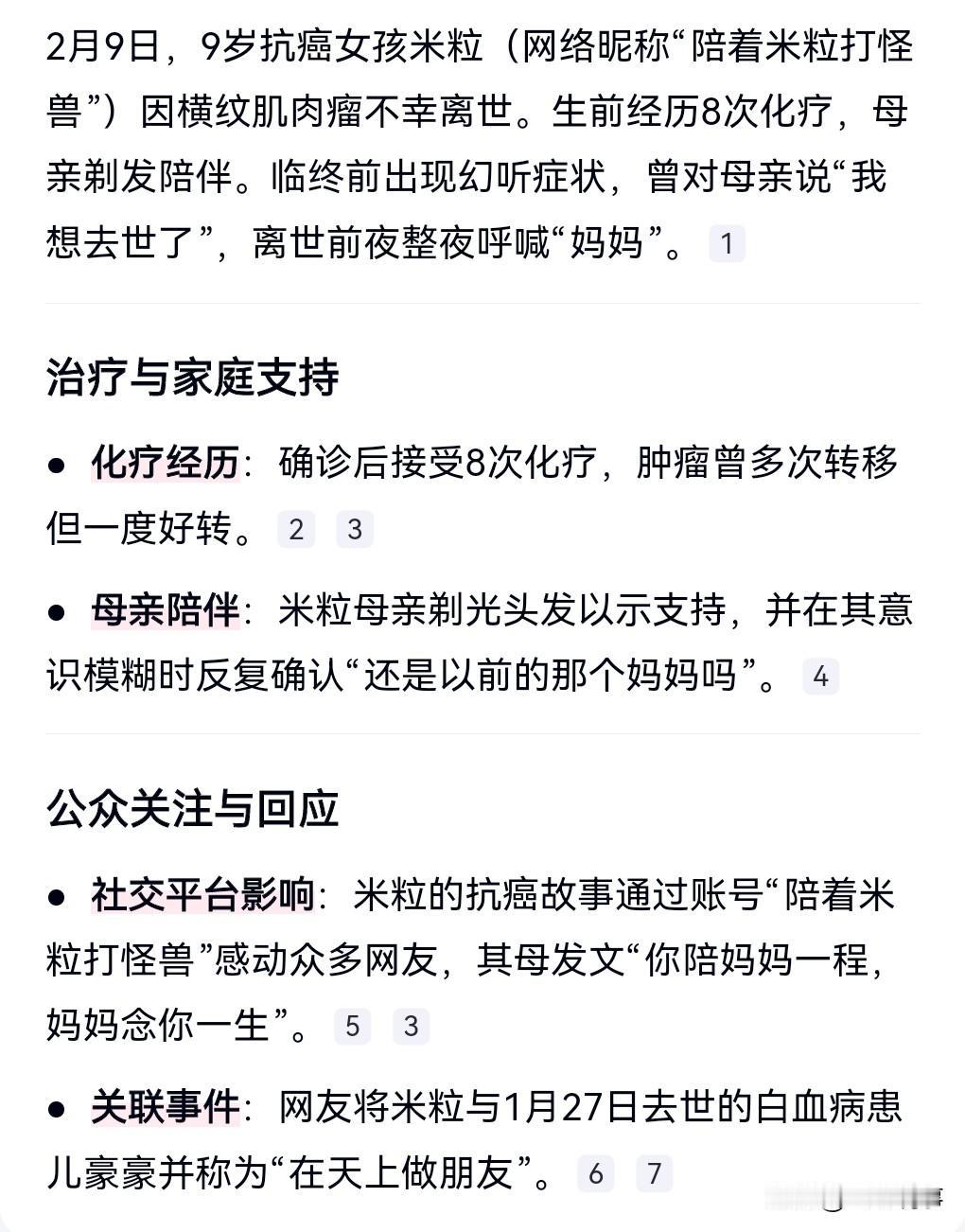 这真是太悲剧了,才9岁就去世了,这世界真是太不公平了。 2月9日,9岁抗癌女孩米粒去世,得的是横纹肌肉瘤。 生前经历的8次化疗,母亲曾陪她一起剃光头,这真的是母爱。 曾对母亲说我想去世了。去世前夜整夜呼喊妈妈。 一周之前刚过完生日,没想到病情发展的如此迅速。 病魔实在是太可怕了,夺去了那么多年轻的生命。 在医学这条路上,那真是任重而道远啊。