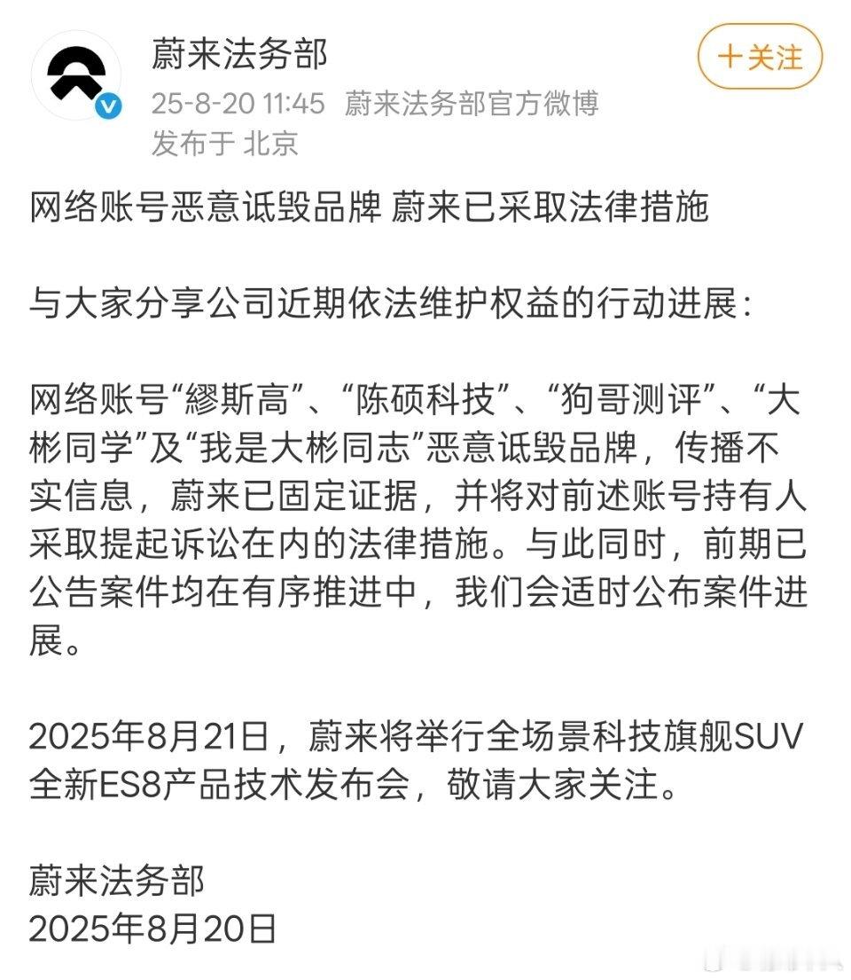 不知道蔚来法务部起诉“我是大彬同学”的进展如何了。