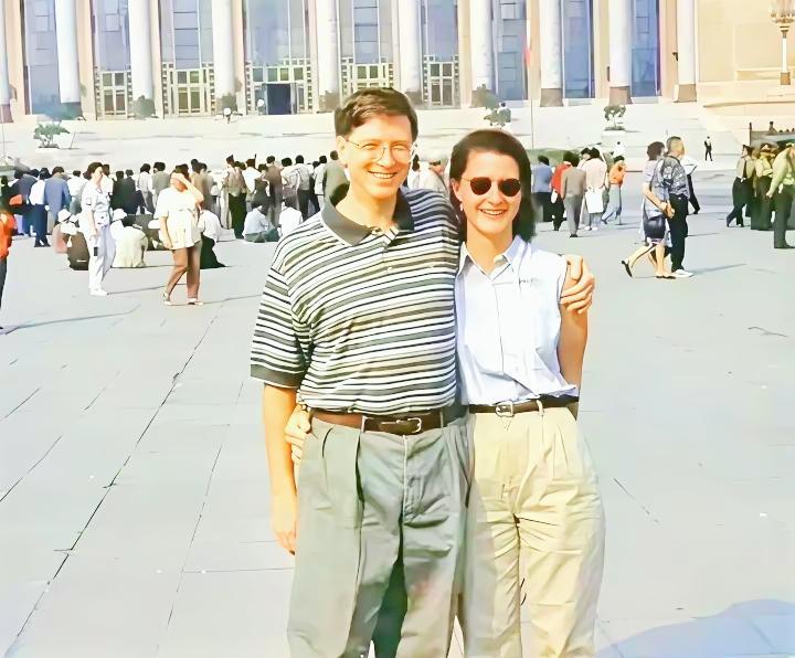 90年代,比尔盖茨和新婚妻子梅琳达来到中国洽谈商务之际,夫妇两人在天安门前的一张留影。