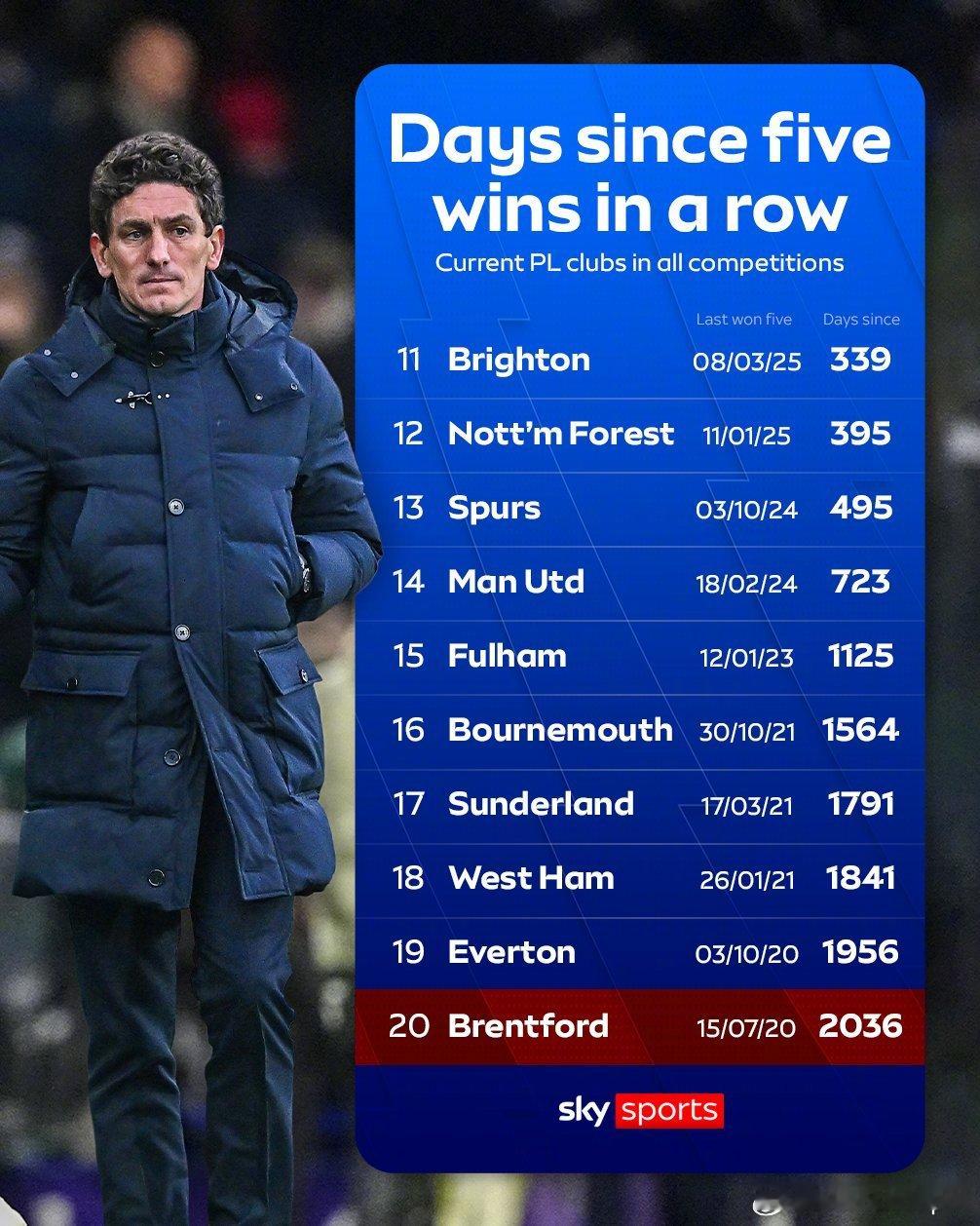 天空体育统计的英超各队距离上一次各项赛事五连胜间隔天数。