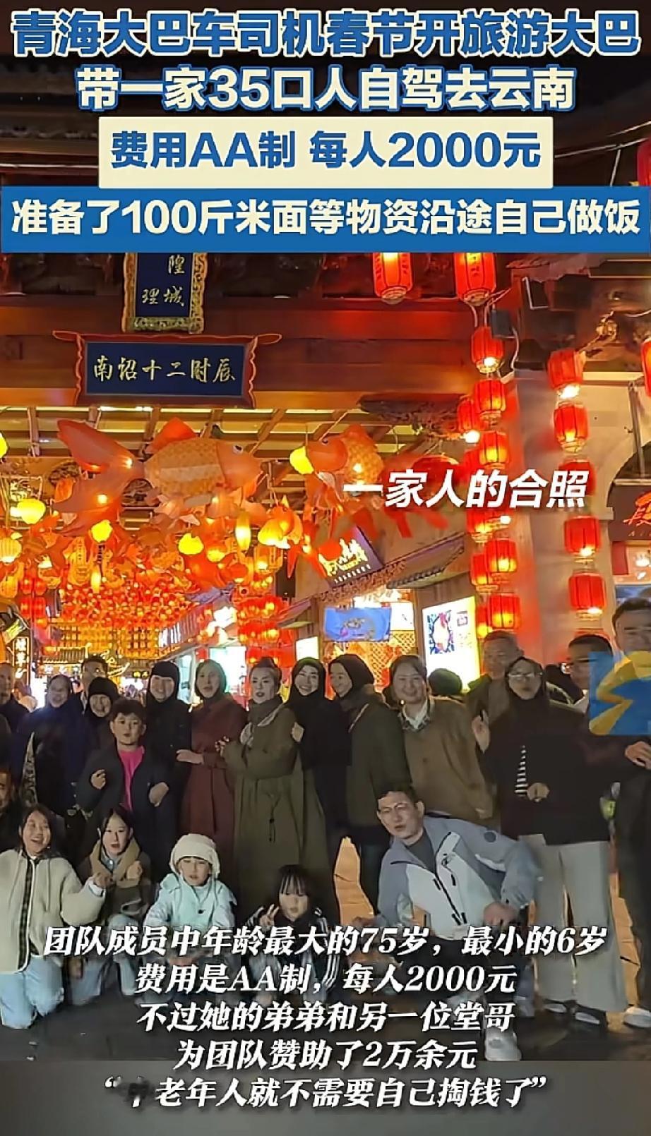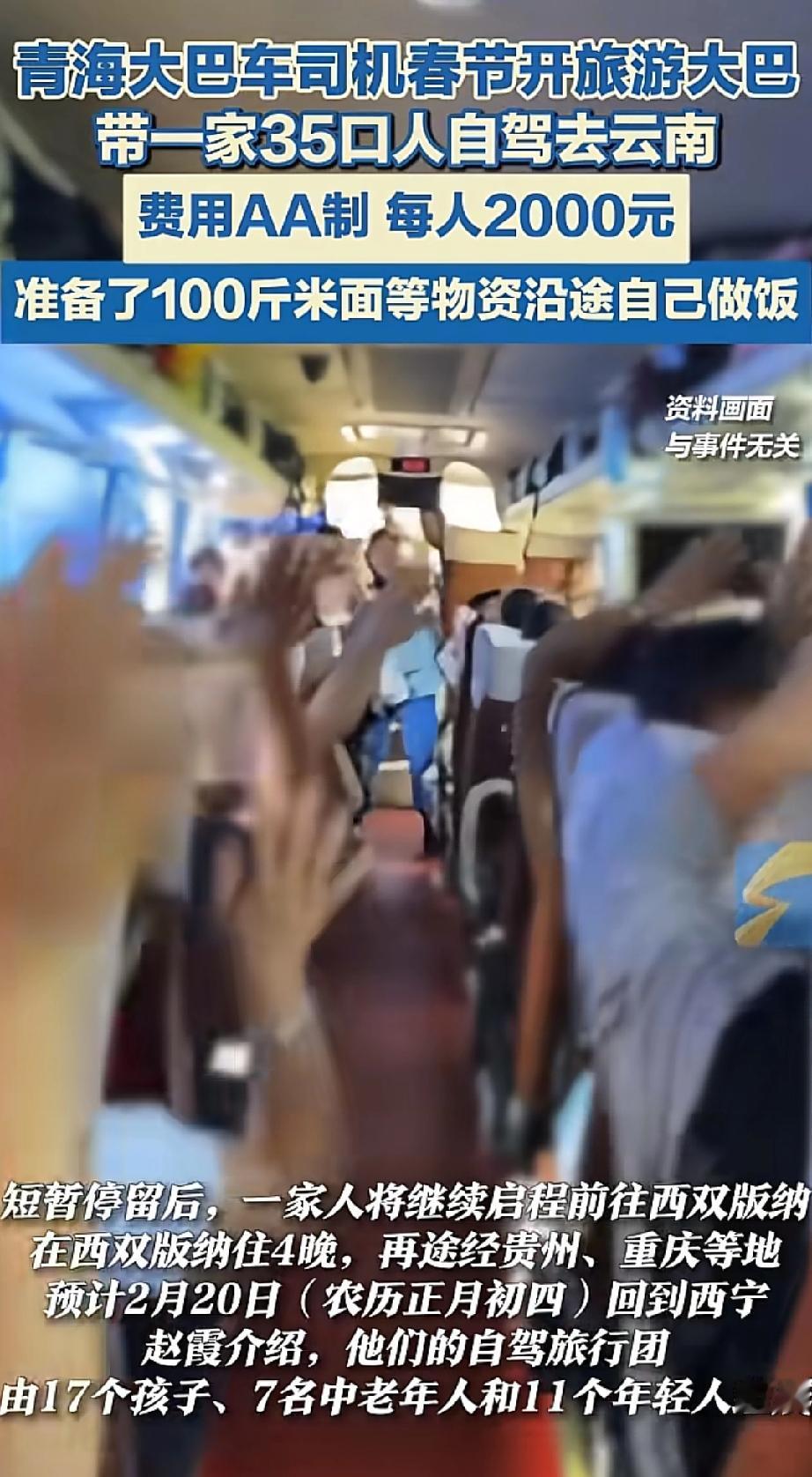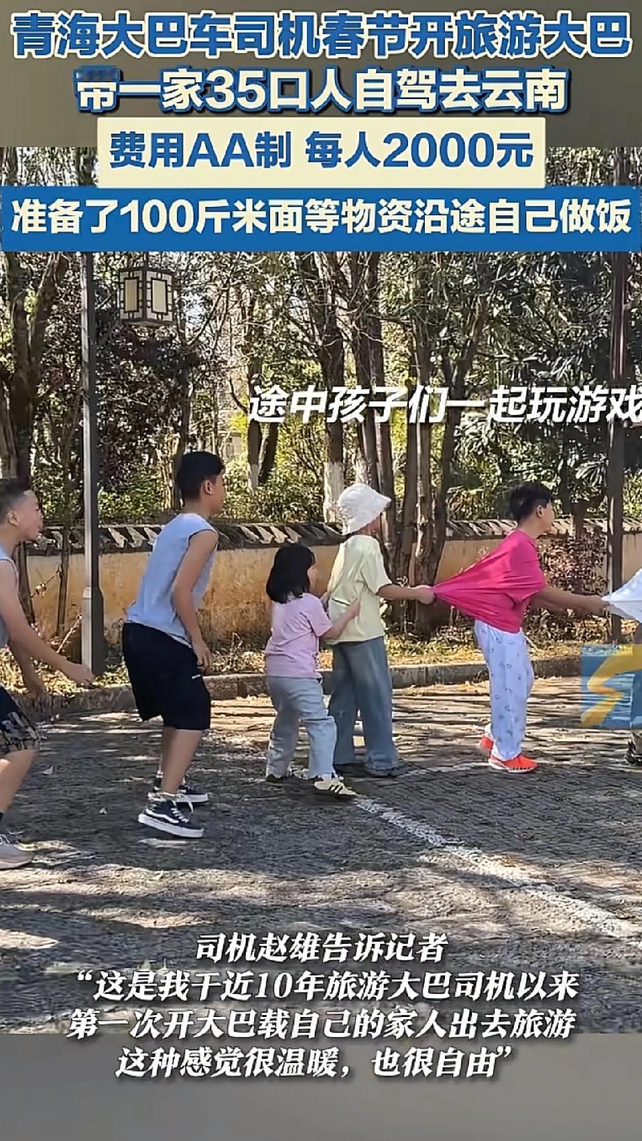 太羡慕了!青海一家35口人开旅游大巴赴云南自驾游,采购100斤米面等物资沿途自己做饭,当事人:往返14天,弥补缺失的陪伴 一辆大巴,35口人,17个娃7个老人11个年轻人。拉上100斤米面,锅碗瓢盆全带着,从西宁一路开往西双版纳。视频里一车人唱着歌,路边架锅做饭,孩子们追着跑。 看见让人忍不住好奇:一辆大巴车35口人,14天,怎么做到不散伙的? 仔细扒一扒这里头的门道——这哪是家庭旅游,简直就是个“家庭上市公司”。 核心管理层董事长: 赵师傅和他爸,爷俩轮班开车。 工作经验:一个干了十年,另一个干了一辈子。 行程目标:为照顾老人,每天不超300公里 旅游路线:2月7日从西宁出发,经四川到云南,在西双版纳住4晚,返程还逛贵州、重庆,每天行程不超300公里 CEO内容输出: 堂妹赵霞团队的导游,每到一处,都事先查阅准备讲解内容,比如当地地方的人文和地理,都会给孩子们普及讲解,就如赵霞说的不仅孩子们学到新东西,自己也掌握了不少新知识! CFO财务隔离: 有人管钱有人记账。自驾车辆是堂哥所在公司的旅游大巴,费用AA制,每人2000元,其中两位兄弟为团队赞助了2万余元,中老年人不需要自己掏钱! COO流程管理: 赵霞说会去品尝一些地方的特色美食,大多数情况都是自己做饭:有人负责做饭,有人负责维持秩序。炉子谁架,菜谁切,娃谁看,分工写在脸上。 风控部合规意识:有网友说:第一反应不是羡慕,是安全。全家人都在一辆车上,开车的心理压力得有多大。” 赵霞说 堂哥自己有一辆大巴车,被公司调用了,此次出游的旅游大巴是公司协调的另外一辆大巴车,出游前已将完整的人员名单信息报备给公司,出于安全考虑,还给每个人都购买了保险 你看,哪有什么岁月静好,全是现代企业制度。 很多人说一大家子出门容易吵架。是,为啥吵?权责利没分清。 这家高明就高明在:把亲戚处成了同事,把旅游做成了项目。 不是说不亲。正是因为太珍惜这趟团圆,才要把容易扯皮的事提前商量明白。钱的事钱上说,活的事活上分。账算清了,情才留得住。 我有个亲戚,年年张罗全家游,年年一肚子气。问就是“都是一家人算那么清干嘛”,结果路上谁多花谁少干,嘴上不说心里记,回来三年不登门。 多少亲情,毁就毁在“都是一家人”这五个字上。 青海这家倒好,大大方方AA,明明白白分工。年轻人出钱,中年人出力,老人只管乐呵。堂妹当导游,讲错了也没人怪;大伯做饭咸了,没人当面抱怨。 这不是冷,这是暖得有分寸。 赵师傅说这是“弥补缺失的陪伴”。我倒觉得,他们补上的不只是陪伴,还有一家人相处的能力。 这能力,比去十趟西双版纳都金贵。 团圆不是憋屈出来的,是经营出来的。 愿你家也有个会当CEO的堂妹,有个肯掏CFO腰包的堂哥。 更愿你明白:亲是亲,财是财,理是理。分得清,才长久。