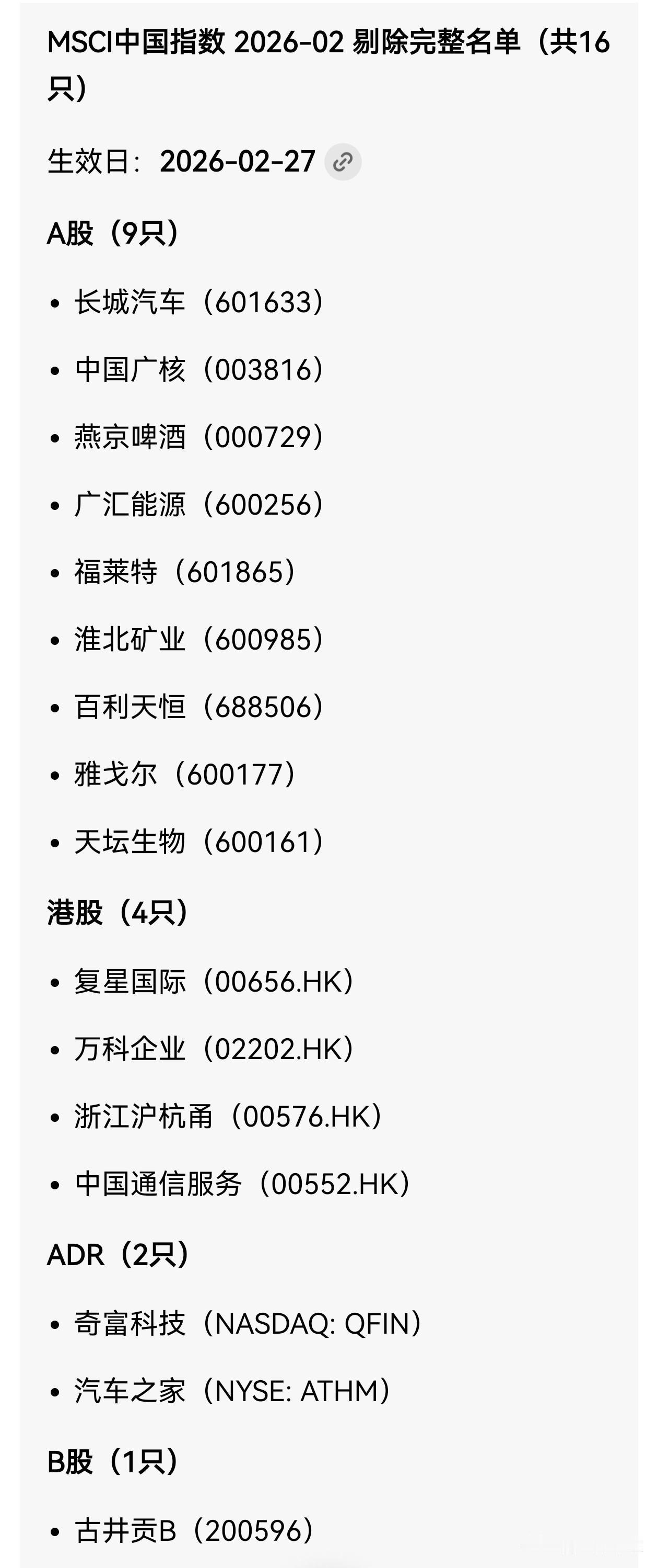 MACI中国A股指数,新增33只股票,剔除18支股票,2月27日生效。 剔出股票