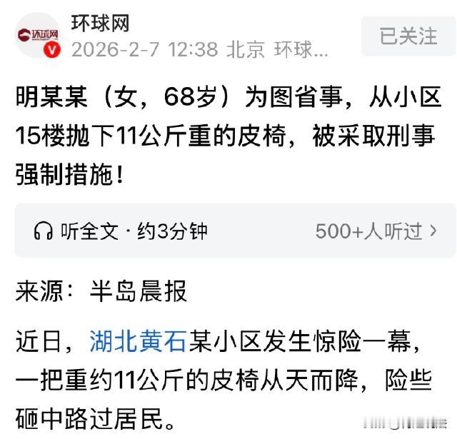 "这个老人又要害人了!"湖北,一位68岁的大妈,因为懒得下楼,竟然将11公斤重的皮椅,直接从15楼丢下去。就在皮椅呼啸着落地时,一位老人、跟一位4岁的男童,恰好从旁边经过,差点就被砸中丢了性命。大妈被抓时,还叫嚣着:"这有什么关系,又没砸死人啊!"真是不知者无畏,气人的很! 这老太太简直是把人命当儿戏。15楼扔下来的皮椅,砸到地上跟炮弹没两样。11公斤重的大家伙,从四十多米高掉下来,冲击力能砸穿汽车顶棚。那位带着孙子的老人要是慢走半步,现在早就上社会新闻头条了。 最可气的是她被抓时那副嘴脸。"又没砸死人"这种话都说得出口,合着非得闹出人命才知错?这就跟醉驾司机说"我又没撞到人"一个德行,典型的不见棺材不掉泪。 小区居民后来爆料,这大妈可不是初犯。平时就爱往楼下扔垃圾,烟头、果皮没少扔。邻居们上门理论,她还振振有词"我家我爱扔啥扔啥"。简直把整栋楼都当她家垃圾场。 法院判得漂亮!以危险方法危害公共安全罪,直接给判了三年。要我说该!这种人就该好好治治。今天扔椅子,明天指不定扔啥。要是轻轻放过,以后谁都敢往楼下乱扔东西。 算那对祖孙命大。监控显示,皮椅砸地上时离孩子就两三米远。老太太要是手偏一点,或者孩子跑快两步,现在就是两个家庭的悲剧。想想都后怕。 其实这种高空抛物的事真不少见。去年深圳有个男的扔酒瓶,把楼下大妈砸成植物人。最后赔了百来万,自己也蹲了大牢。怎么总有人不信邪呢?非得等出大事才后悔。 小区物业也该长点记性。既然有住户反映过这大妈乱扔东西,早就该加强巡查。装个朝天摄像头,或者每层放个警示牌,说不定就能避免这次惊魂事件。 现在有些老年人确实不像话。仗着年纪大就觉得能无法无天。法律面前可不论岁数,该判就得判。要是都惯着这些老毛病,社会还不乱套了。 各位读者你们怎么看?欢迎在评论区讨论。对老人下手太恶 老人伤人 大妈坠楼案 老人爬楼椅 湖北襄阳大爷