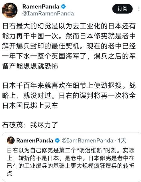 日本有个迷之自信,上面的认为放开手脚,发展军备就能暴兵,让全世界震撼,下面的则认为,日本在过去已经积累了很多的资源,就埋在日本海岸的下面,只要日本发动战争机器,日本将再次伟大,这种不切实际的白日梦,日本是不愿意出来了,看看选票就知道了。 但他们始终没有想明白的一件事情就是,和平宪法看着是绑住他手脚的绳子,其实也是护身符。一旦他真以为甩开这绳子就能撒野,那不好意思,那时候就可以直接标红、点名、当敌人看的人了。对待敌人,而我们对待敌人是很有一套的。 咱们这边卧薪尝胆多少年了,全产业链的工业底子摆在这。收拾逆子怕打坏花花草草,菲律宾又不够资格,而日本这靶子,尺寸、分量、火候,刚刚好。 这一次,就用西方最熟悉的丛林法则,告知他们,什么叫做百年未有之大变局!