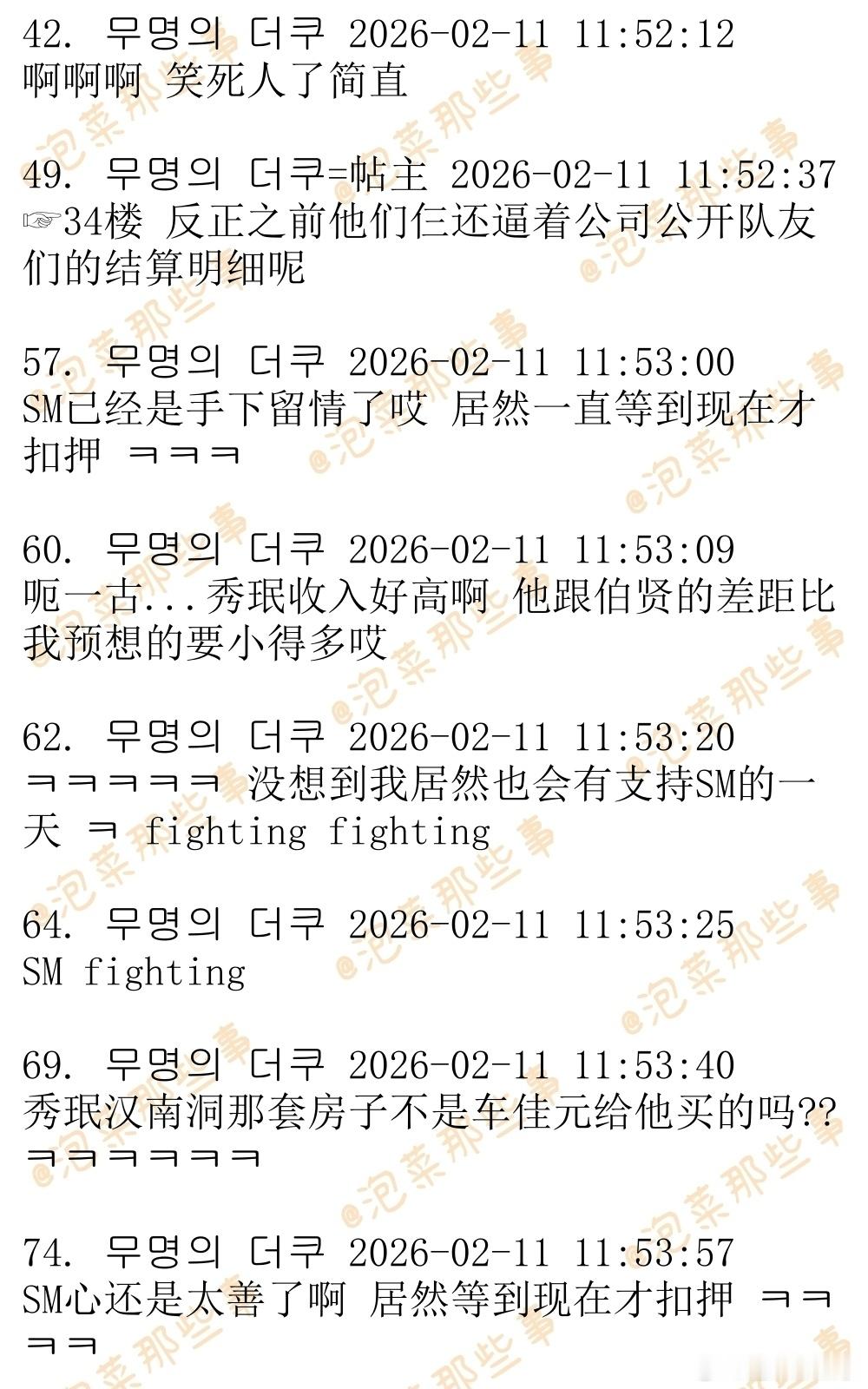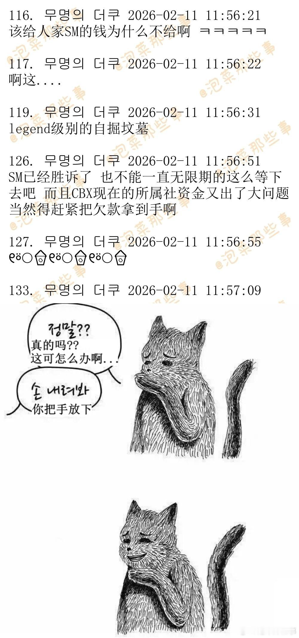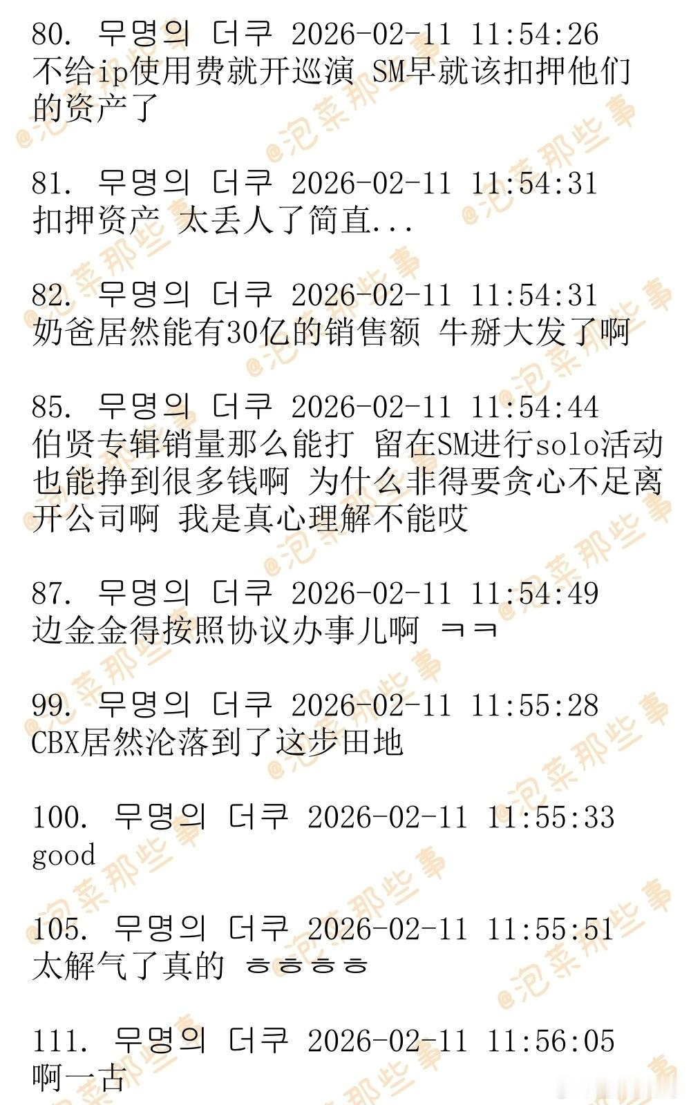 🔥🔥韩网700楼热帖评论翻译🔥🔥SM对CBX资产扣押SM扣押边伯贤金珉锡金钟大资产 据韩媒报道,SM娱乐近日对EXO成员金钟大、边伯贤、金珉锡(CBX)的资产进行了扣押,以确保其个人活动收入10%的债权。CBX三人于2023年以合约期限不正当等为由,单方面向SM通报解除专属合约,并于次年以向SM支付个人活动销售额的10%为条件转投其他公司进行活动。但是之后CBX主张SM方面不履行协议,因此拒绝支付这笔款项,最终闹上法庭。据悉,SM于9日和10日耗时两天暂时扣押了金钟大、边伯贤、金珉锡的资产。被扣押的资产包括金钟大住宅全税租金债权、边伯贤位于京畿道九里市的公寓、金珉锡位于首尔龙山区汉南洞的公寓等等。边伯贤的公寓面积为142㎡,金珉锡的公寓面积为166㎡。SM此次向CBX三人追讨欠款共26亿韩元(分别为3亿韩元、16亿韩元、7亿韩元),目的是为了保全按照双方2023年6月签订的协议而产生的相当于个人活动销售额10%的债权。cr.theqoo
