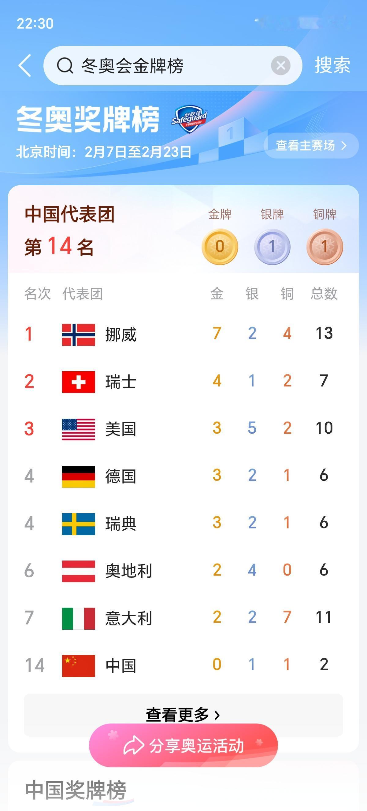 截止到今晚,中国队以一银一铜的成绩,在冬奥会上排在第14名,刘佳宇摔倒没能进入决赛,今天颗粒无收啊。 挪威还是一如既往的强势,以7金2银4铜排名榜首,不愧是冰雪王国! 期望中国队在本届冬奥会上能有所突破!