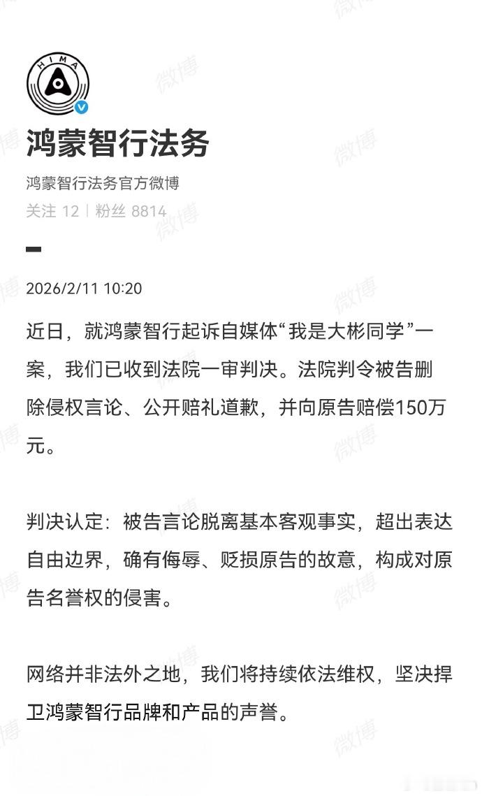 鸿蒙智行对大彬的起诉有结果了:道歉+赔钱150万不知道蔚来那边的判决结果会是如何?大彬也算是米系KOL的核心了这波赔的不少不过听说是富二代。意大利留学估计不差钱你对大彬哪句话言论印象深刻?