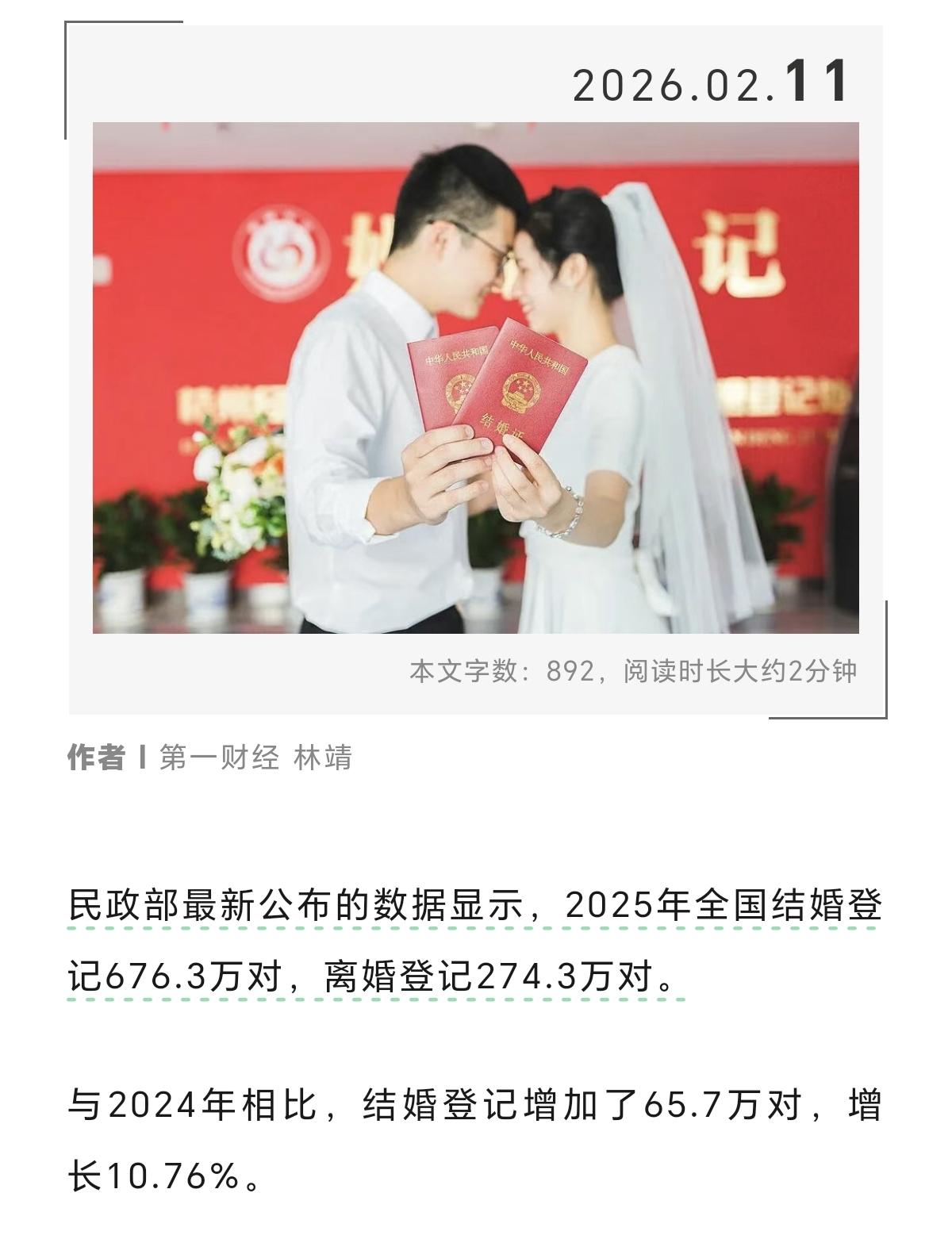 根据民政部最新公布的数据显示,2025年全国结婚登记676.3万对,离婚登记274.3万对。与2024年相比,结婚登记增加了65.7万对,增长10.76%。 来源:第一财经
