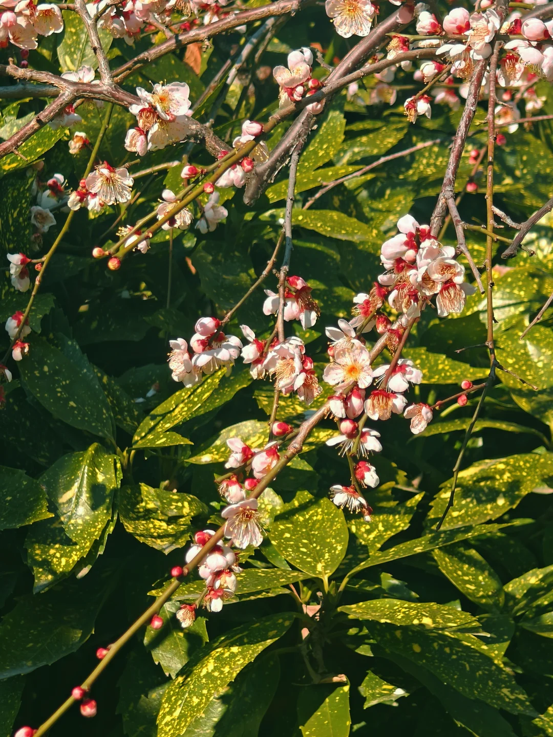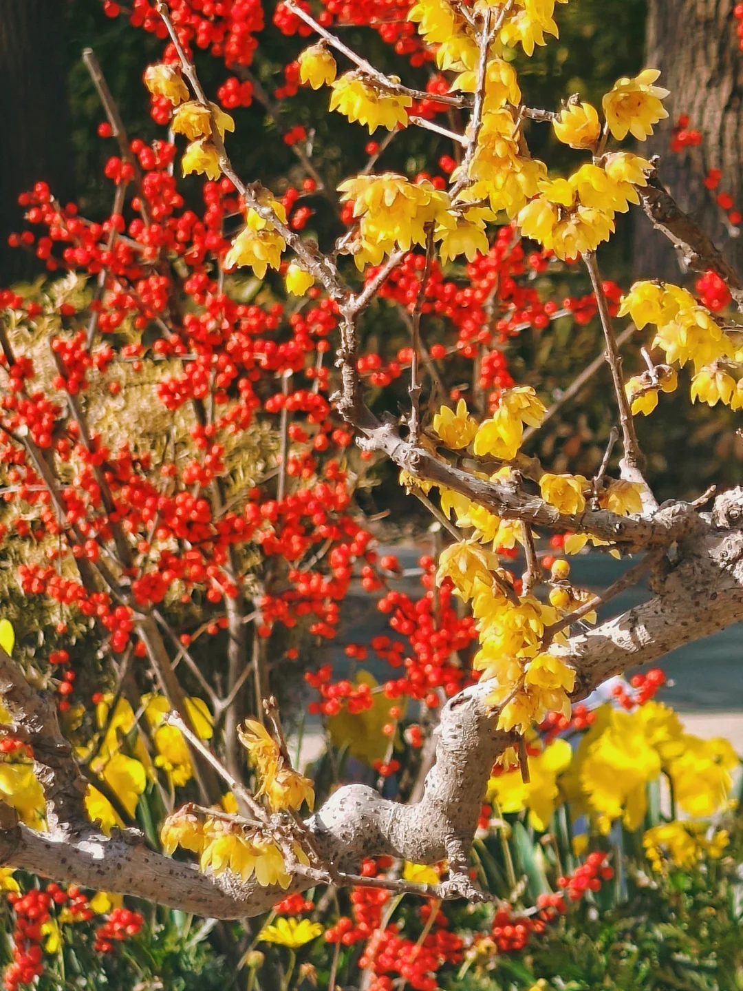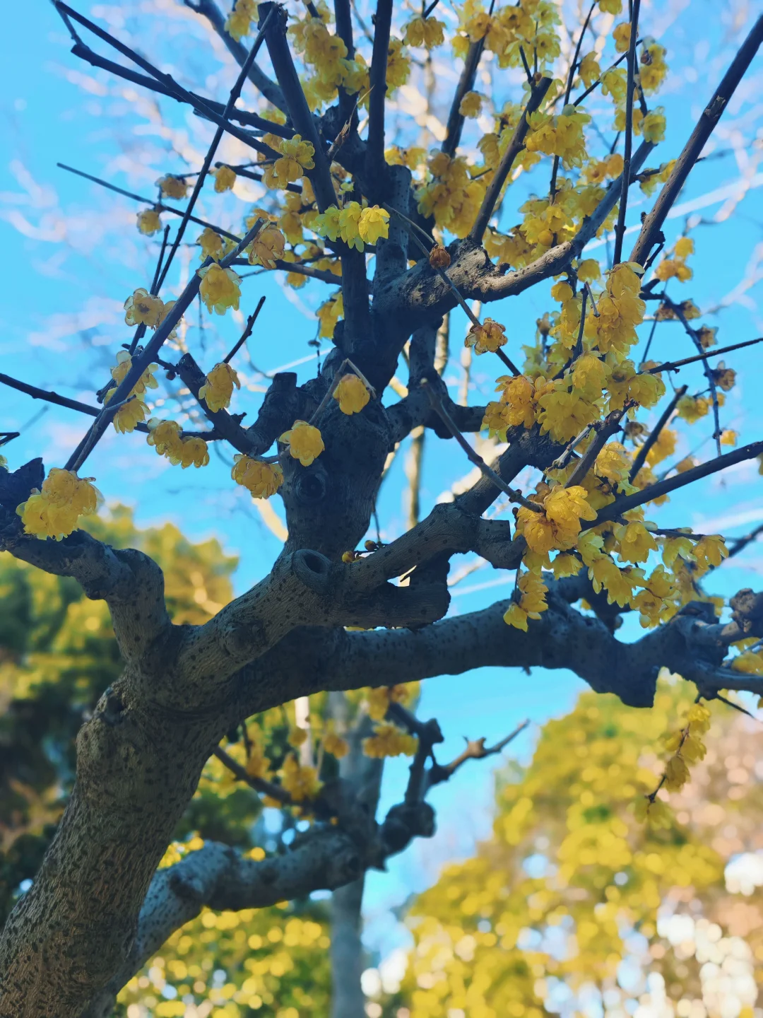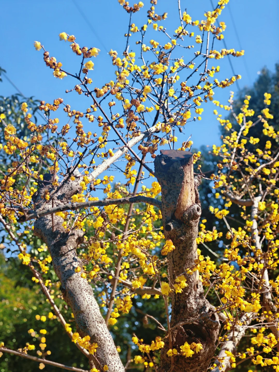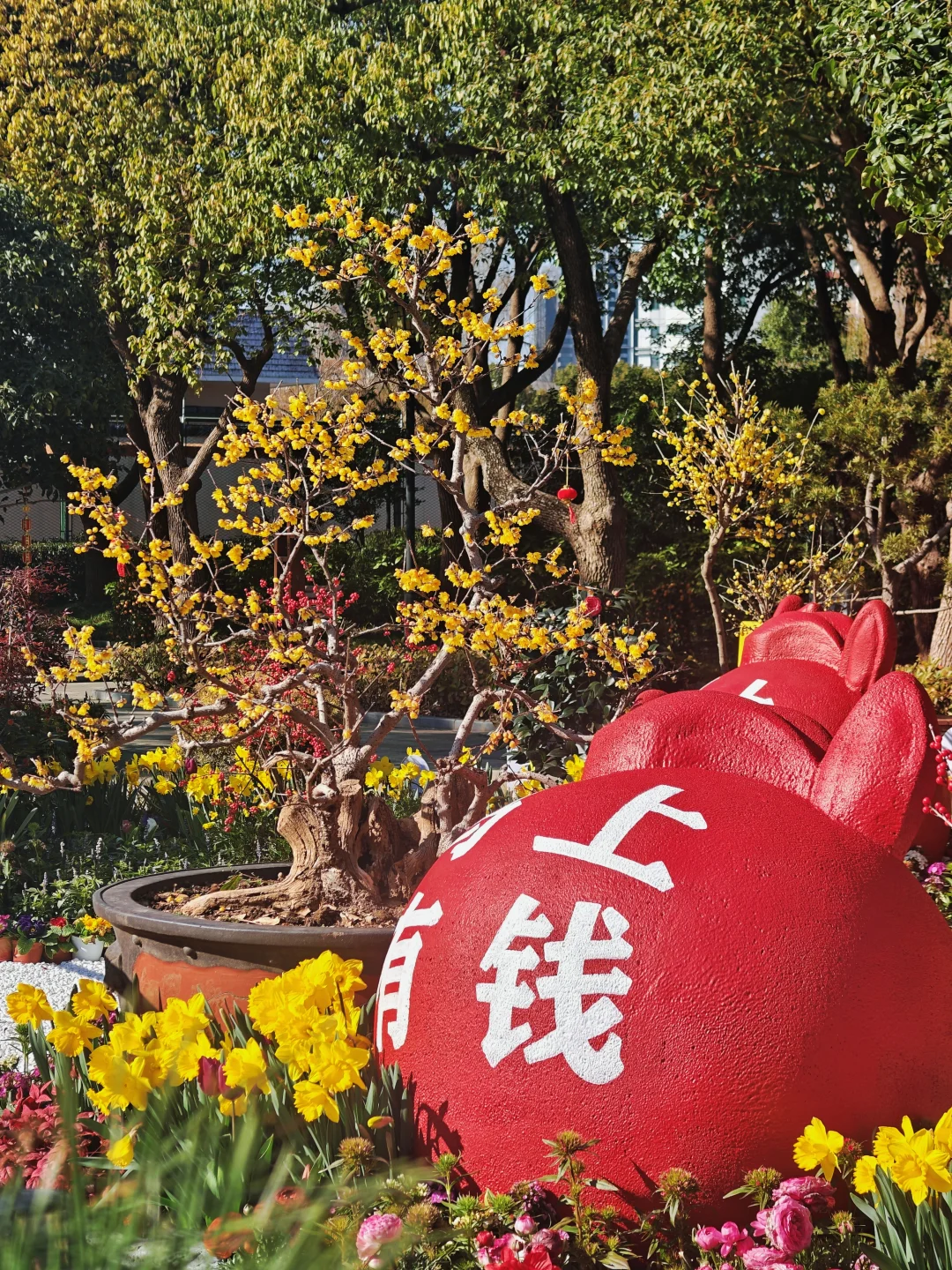 🌸沿公园主路线、水景边都种着蜡梅,主打素心蜡梅,金黄的花缀满枝头,走在里面满是清香。同时还有百余盆造型各异的蜡梅盆景,老桩、古桩蜡梅,形态各异。除了蜡梅,还有红梅盛开。