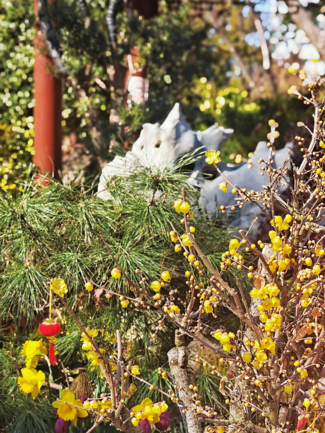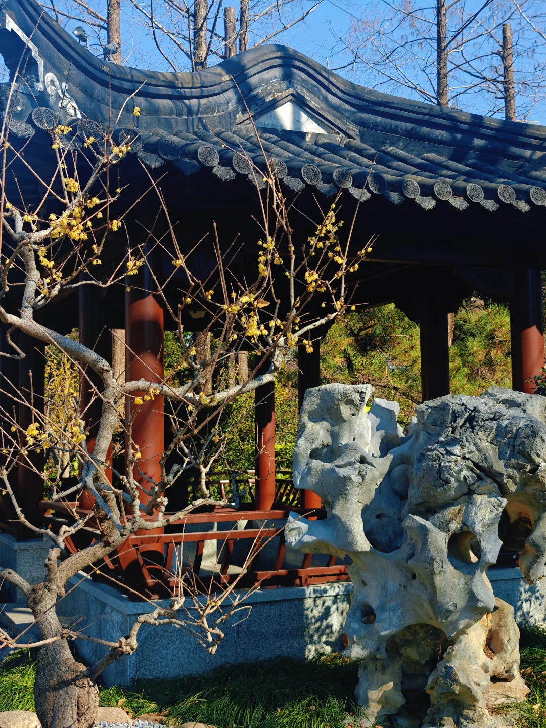 🌸蜡梅和假山、亭子、松竹等搭配的经典景致还挺出片,有不少长枪短炮的老法师架着三脚架拍照。