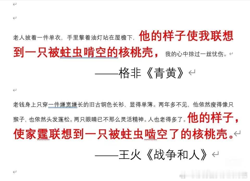 到了王火笔下,这只“核桃壳”只是被“啃”字换成了文绉绉的“啮”字,便原封不动地安在了“老钱”身上。