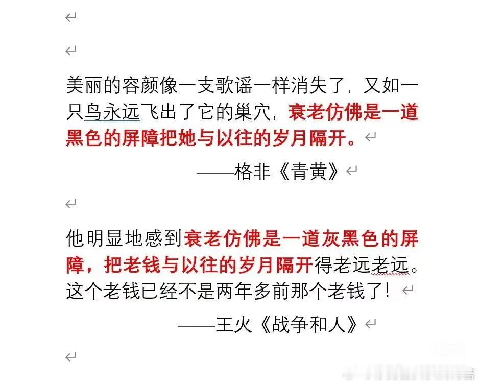 更绝的是,格非将“衰老”形容为“一道黑色的屏障”,王火照单全收,仅仅多加了个“灰”字,变成“灰黑色的屏障”。他仿佛在说:看,我调了色,这是我的了。