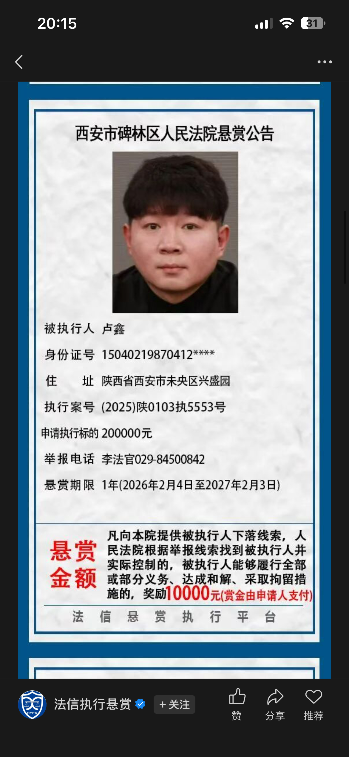 相声演员卢鑫被法院执行悬赏1万悬赏?下落不明?