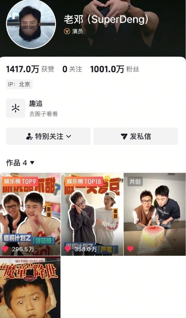 邓超新账号5天粉丝破1000万! 邓超2月6日入驻抖音了,5天时间粉丝已经破1000万,这么大咖位的明星自己不会主动开通账号的,平台会亲自邀请,谈好条件和待遇才会入驻,邓超演戏的口碑还行,一个金鸡影帝,一个百花男配,但是自己执导的作品拍一部赔一部,他的国民度和路人缘还是挺好的。