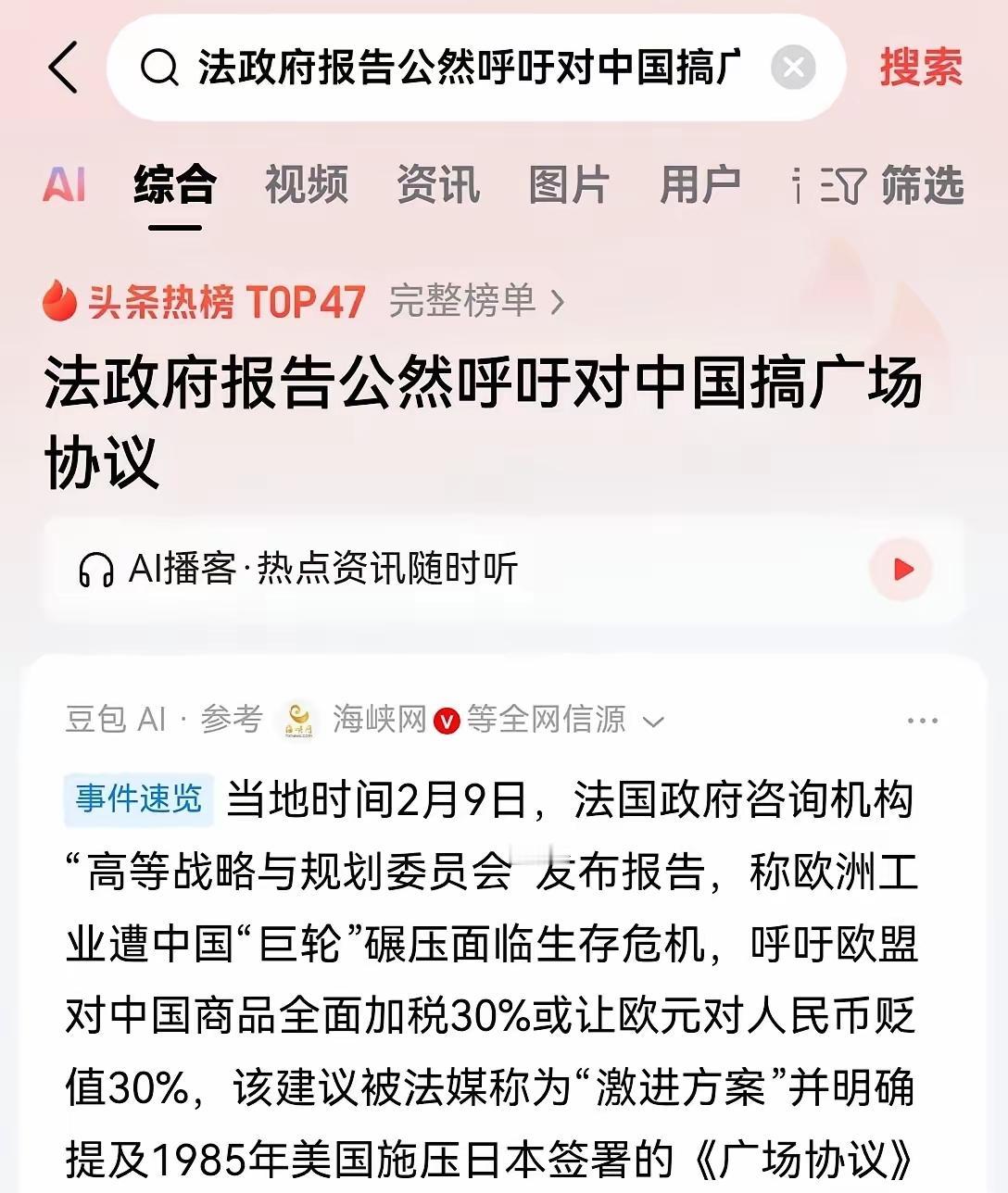 法国的一个提议,让中国网友目瞪口呆! 众所周知的是,这些年咱们与法国的交往,还算凑合;毕竟中法友谊源远流长,双方在多方面有着互补。 只是让中国网友没想到的是,他们居然牵头想搞第2个广场协议,这一次是针对中国! 法国政府报告提议,应该整个欧盟全面对中国加税30%,或者让欧元兑人民币,贬值30%,来应对日益严峻的中国制造商品的挑战。 真的是让人目瞪口呆啊! 上回马克龙访华,咱们是给了足够礼遇的,连大熊猫都赠送了,看起来双方也是宾主尽欢的,而马克龙甚至在社交媒体发文称,“唯一的遗憾是时间太短”。 所以,这给人什么感觉呢? 尽是一些当面一套,背后一套的货色! 不过在这里也想弱弱问一句:法国人的飞机、香水、红酒……真的不愁卖吗?