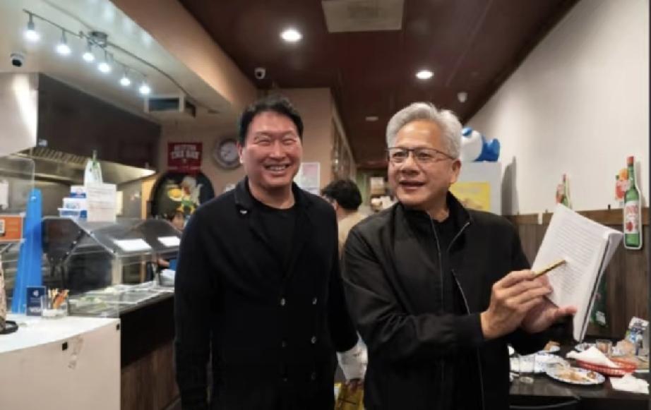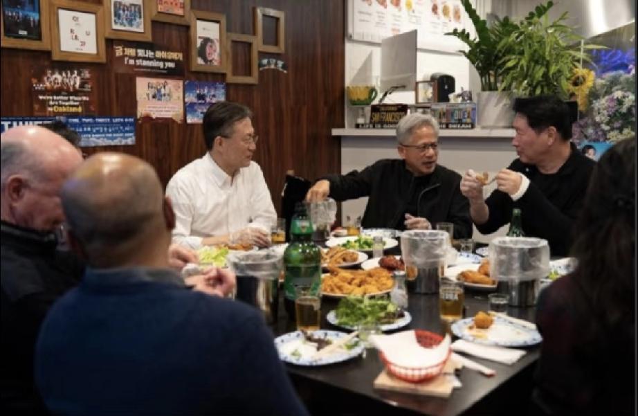 黄仁勋在美国硅谷炸鸡小店与韩国SK大佬崔泰源聚餐,黄仁勋松弛感满满! 近日,在中国待了几天的黄仁勋,终于回到了美国硅谷的家,不过他没有在家歇着,而是继续拓展事业,跑到英伟达公司附近的一家炸鸡店吃炸鸡。 黄仁勋不是一个人过来的,而是约了韩国SK集团的老板崔泰源,黄仁勋带着自己的女儿黄敏珊,而崔泰源则带着长女黄允祯。 黄允祯是崔泰源与前妻所生,如今在SK集团担任战略本部长,而黄敏珊则在英伟达硅谷公司担任营销总监。 黄仁勋依旧穿了皮衣,穿得还挺厚的,可能美国那边天气冷了。 黄仁勋一见到崔泰源就站着聊个不停,有说不完的话,果然是同行,有很多共同语言,还可能将来有合作的机会。 接着,黄仁勋与崔泰源还有几个大佬一起坐在炸鸡的一个小桌子旁,继续一边吃一边聊。 桌子上摆着炸鸡和啤酒,黄仁勋光顾着聊天顾不上吃饭,但他斜靠在椅子上那个姿势是非常放松的,就好像普通人在外面漂泊多年,回到了家乡一样,有一种归属感。 最后,黄仁勋与崔泰源拿了一个本子,拿了一支笔在上面比划着,应该是将来有合作计划吧,毕竟英伟达也一直在发展。 两位大佬的女儿只是在旁边听着,没有插话,据说,黄仁勋与崔泰源讨论的是半导体和生物综合的人工智能AI事业的合作。 果然是黄仁勋的业务,他被称为AI教父,可不是吹的,处处都在AI,他之前在上海小摊买水果都被店主夸赞,不坑人不骗人,专门AI,听着挺搞笑,但确实如此。 总之,从两位大佬吃饭时放松的表情能看出来,两位是志同道合,将来肯定有很多业务要合作,黄仁勋回到美国硅谷,才是真正的回到了家里,特别放松。