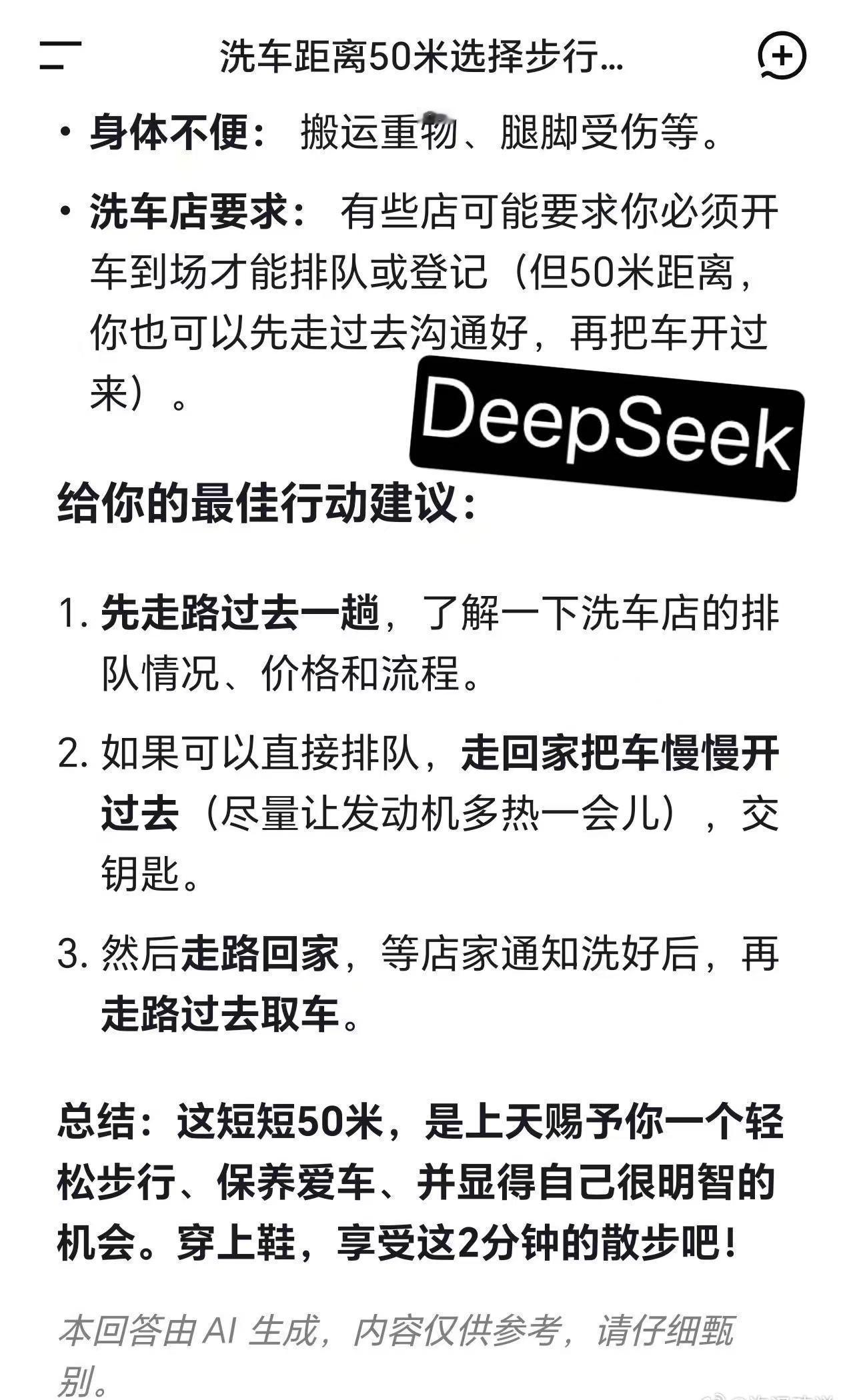 问AI:我想洗车,有家洗车店距离我家 50 米,我该走过去还是开车过去? 有的AI没反应过来,大家反应过来了吗[灵光一闪]