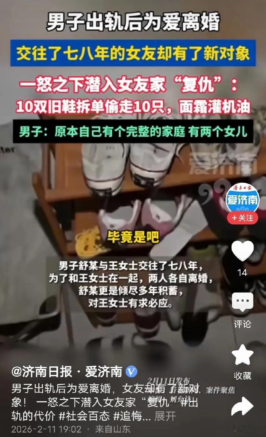 真是咎由自取!上海男子和女子背叛家庭偷偷摸摸搞到一起,女子离婚后不断教唆男子离婚,承诺离婚就在一起。男子鬼迷心窍,狠心抛妻弃女,没想到,他离婚后,女子却翻脸不认账,不仅不嫁,还交了新男友。男子气急败坏,潜入女子家中,往面霜、剃须膏里灌机油,还扔掉室友10只鞋子。室友报警处理,结果男子悲剧了。 2025年9月份开始,舒某发现他的女友王女士对他越来越冷淡,没有以前那么爱他了。 舒某着急不已,他可是为了王女士抛妻弃女,家庭没了,钱也没了,别到最后让他人财两空啊。 原来,舒某原本有一个幸福美满的家庭,两个女儿乖巧懂事,妻子勤俭顾家,可舒某却不知足。 2017年,他偷偷跟已婚的王女士搞到一起,他本想着家里家外两头占、左右逢源。 谁料,王女士跟他在一起后不久竟离婚了,她说她爱的是舒某,想跟舒某在一起一辈子。 为此舒某很感动,对王女士的爱有增无减。 王女士离婚后,跟舒某在一起的时间更多了,把所有的心思都放在舒某身上,她说她是为了舒某才离婚的,舒某可不能辜负了她。 王女士还说,等舒某离婚了,她就嫁给舒某。 之后,在王女士的不断教唆下,舒某把心一狠,也跟妻子离婚了。 舒某以为他离婚后很快能跟王女士在一起,可事情并未如他所愿。 王女士总说等两人挣够了钱,等经济条件再好一些再结婚。 这一等就等了7年多,这些年舒某在王女士身上几乎花光了积蓄,他对王女士是有求必应,只要王女士开心,花多少钱他都愿意。 他以为他把王女士哄开心了,王女士会对她不离不弃。 没想到,2025年9月底王女士跟舒某提出了分手,她说她已经交新男友了。 舒某气愤不已,2025年10月10号那天,他跑到王女士租房一顿发泄。 了王女士非但没有回心转意,反而更加厌恶他。 11月2号那天舒某把王女士约出去吃饭,本想挽回她,可王女士铁了心坚决要分手。 舒某越想越气,11月3号那天翻墙潜入王女士和室友的租房,当时王女士没在家,王女士的室友在她房间里睡得正香。 舒某进房租房里后,他先是把随身携带的机油撒在地板上,然后又用刀划烂王女士的衣服,最后再将机油倒入王女士面霜和她男友的剃须膏中。 做完这一切后,为了制造成有小偷入室的假象,舒某还把王女士室友的10只鞋子扔到窗户外边的绿化带。 舒某离开后不久,王女士回到家,她一进屋瞬间一股刺鼻的味道传来,她赶紧打开窗,再敲开室友吴女士的房门。 所幸吴女士房间的窗户是开着的,才没被那刺鼻的机油味呛到。 事后吴女士报警,警方通过调查周边监控,很快锁定嫌疑人舒某。 舒某被抓后,如实交代了他的犯罪事实。 不得不说舒某真是个“人才”! 为了一段婚外情抛妻弃女,听信对方承诺就把好好的家拆了,七年付出、钱财散尽,最后只换来一句分手。 被甩后不反思自己,反倒潜入别人家里搞破坏,往面霜、剃须膏里灌机油,还乱扔室友鞋子,以为能泄愤报复,结果直接把自己送进警局。 一步错步步错,背叛家庭在先,违法犯罪在后,既毁了原配和孩子,又害了自己,从头到尾都是咎由自取,半点不值得同情。 根据《刑法》第245条规定,非法搜查他人身体、住宅,或者非法侵入他人住宅的,处三年以下有期徒刑或者拘役。 舒某因为感情不顺,就偷偷翻墙闯进别人出租屋,这已经是私闯民宅,严重侵犯了别人的居住安全,属于犯法行为。 根据第275条规定,故意毁坏公私财物,数额较大或者有其他严重情节的,处三年以下有期徒刑、拘役或者罚金。 他故意往护肤品、剃须膏里灌机油,划破衣服、扔掉鞋子,就是故意损坏别人的东西,给他人造成财产损失,同样构成犯罪。 他本来就背叛家庭有错在先,最后还用上违法手段报复,情绪上头不计后果,最终只能自己承担法律责任。 目前舒某已经被检察院依法批准逮捕。 被捕后舒某懊恼地说,我原本拥有一个幸福美满的家庭,两个女儿很懂事,妻子也很爱我,这一切都是我太过听信王女士,一时糊涂。 好好的家被自己亲手作没,为了一段见不得光的感情抛妻弃女,最后人财两空还把自己送进看守所。一步错步步错,全是自己贪心又糊涂,既伤害了家人,又触犯了法律,如今再后悔也晚了,真是活该又可悲。