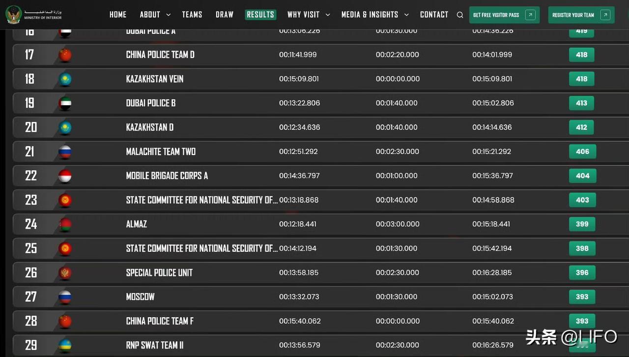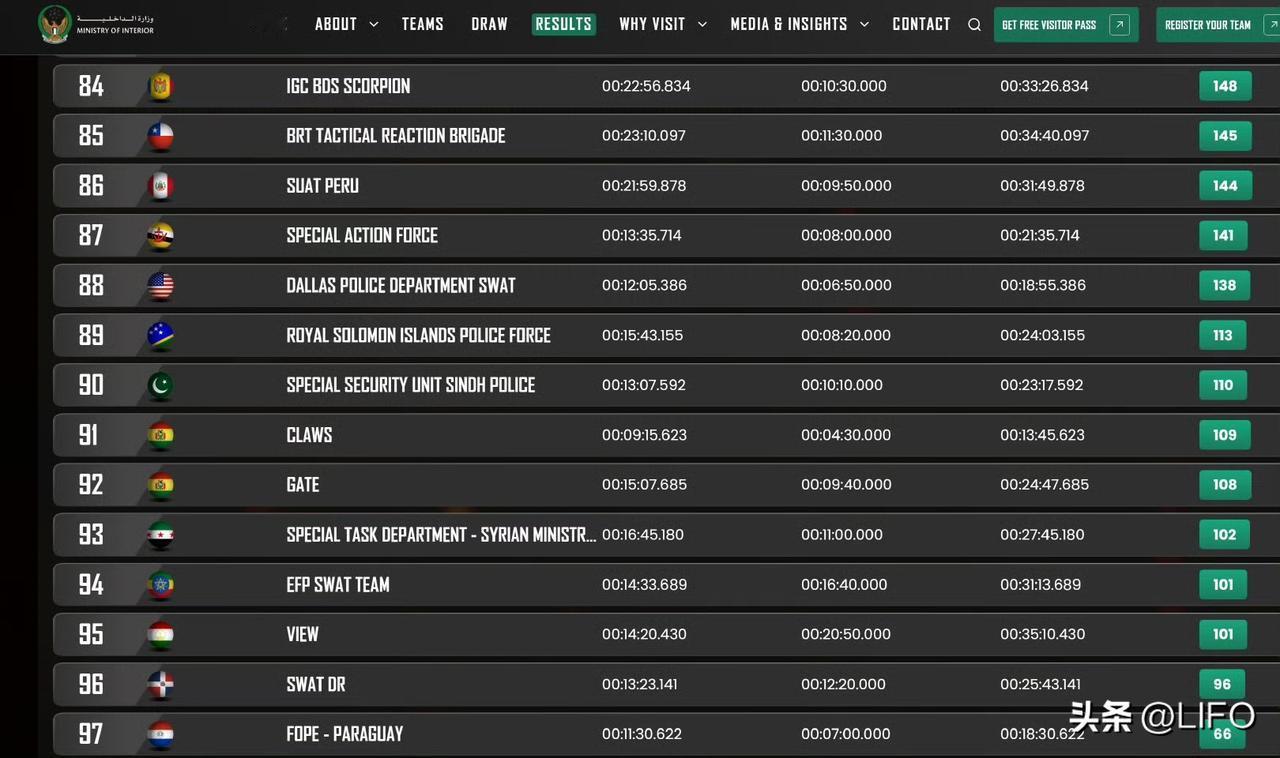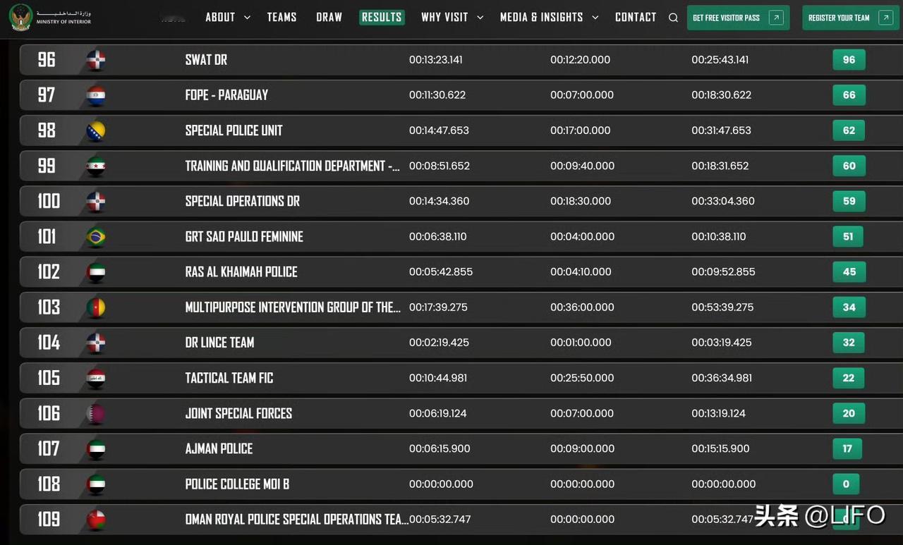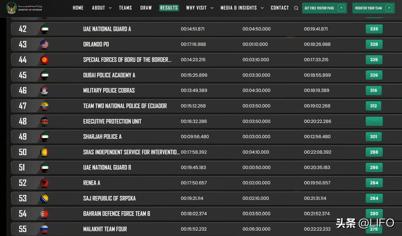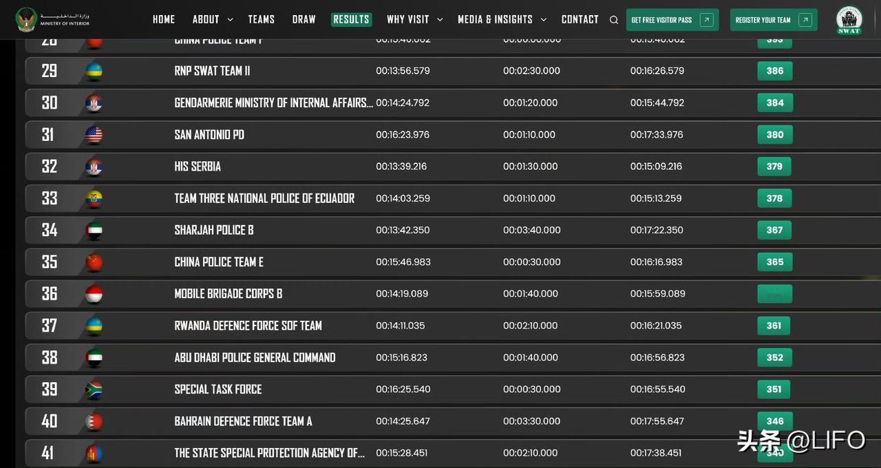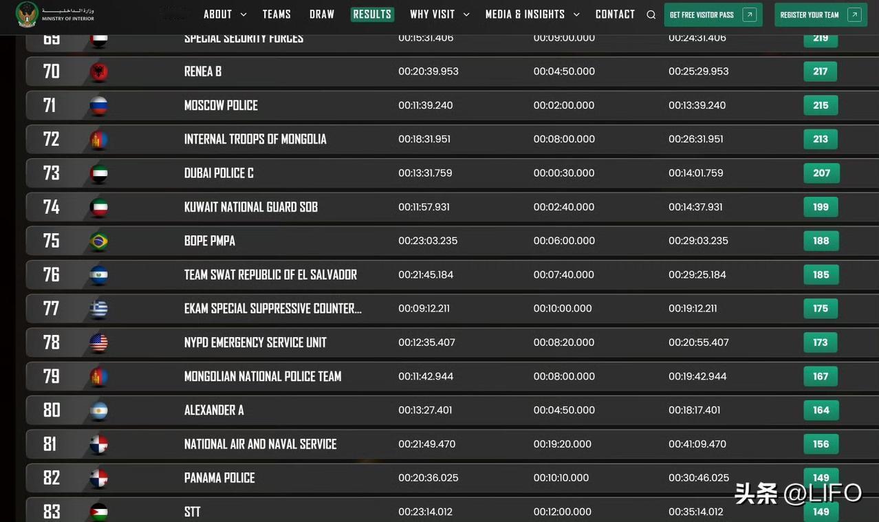 2026年阿联酋特警挑战赛最终排名: 中国 C 队(江苏):总分第三 中国 A 队(特勤):总分第四 中国 B 队(浙江):总分第十一 中国 D 队(新疆):总分第十七 中国 F 队(四川女队):总分第二十八,女队第二 中国 E 队(特勤女队):总分第三十五,女队第三