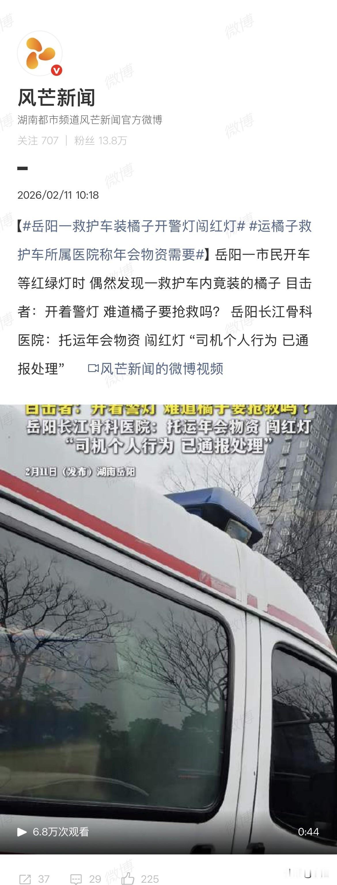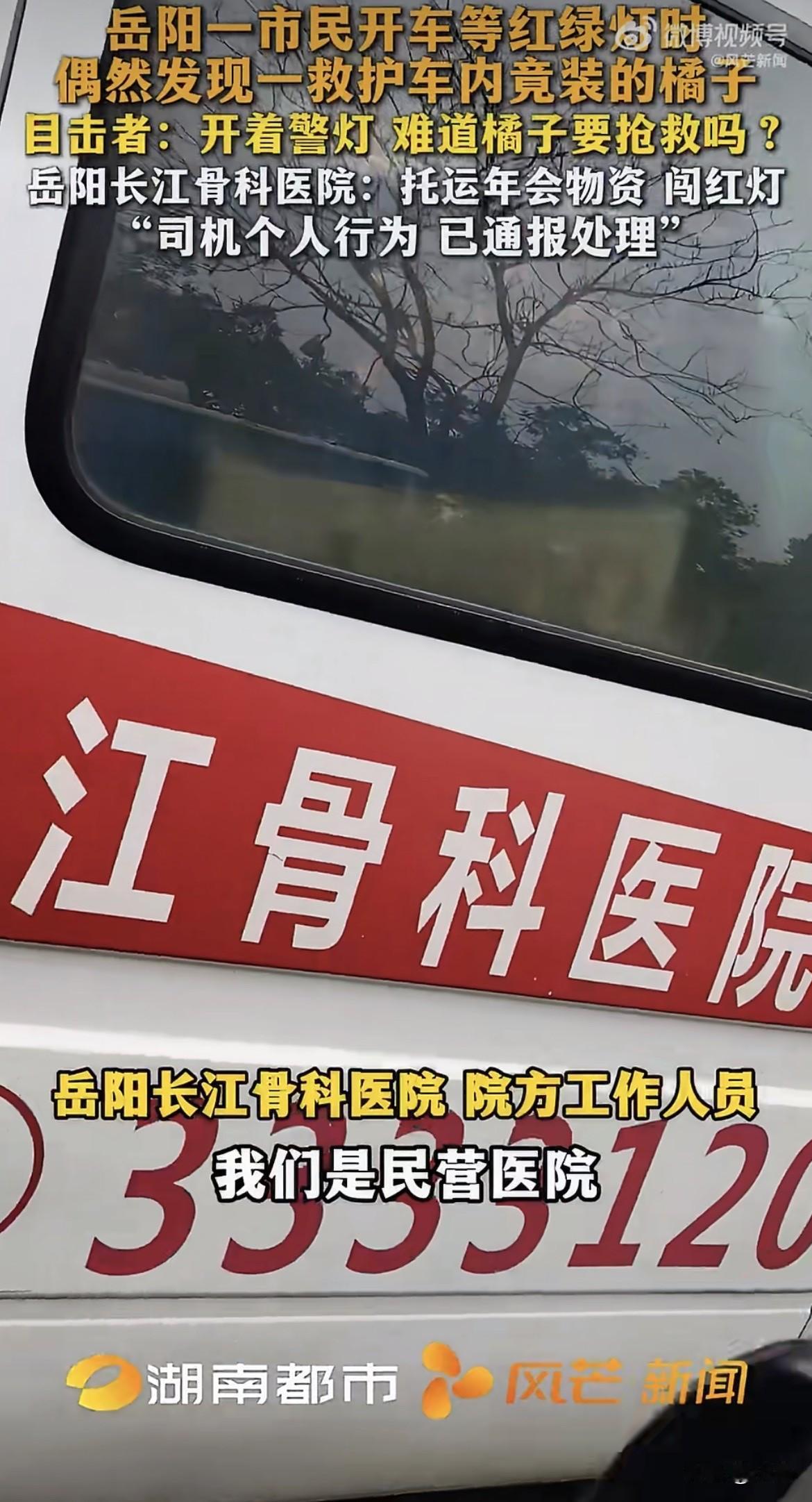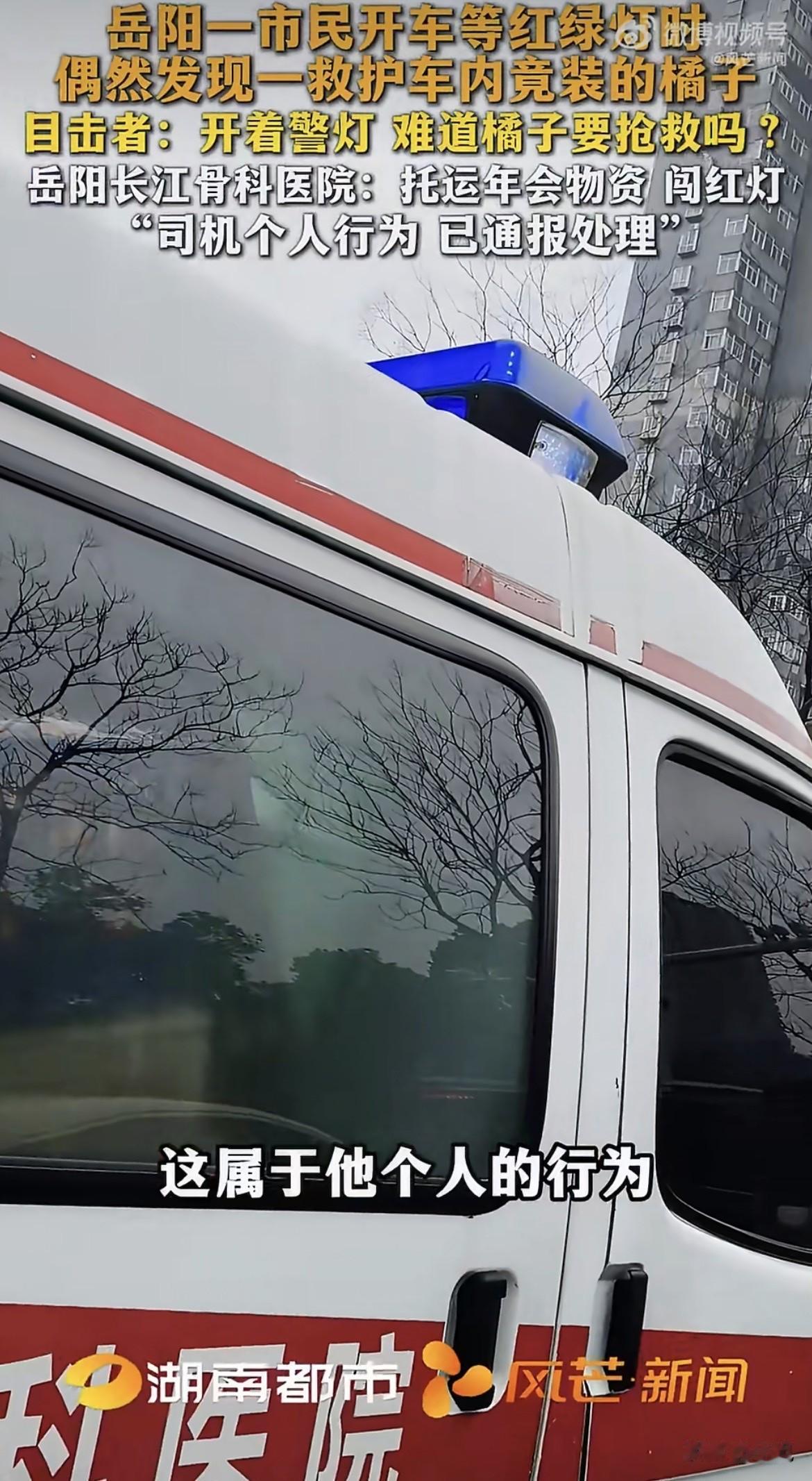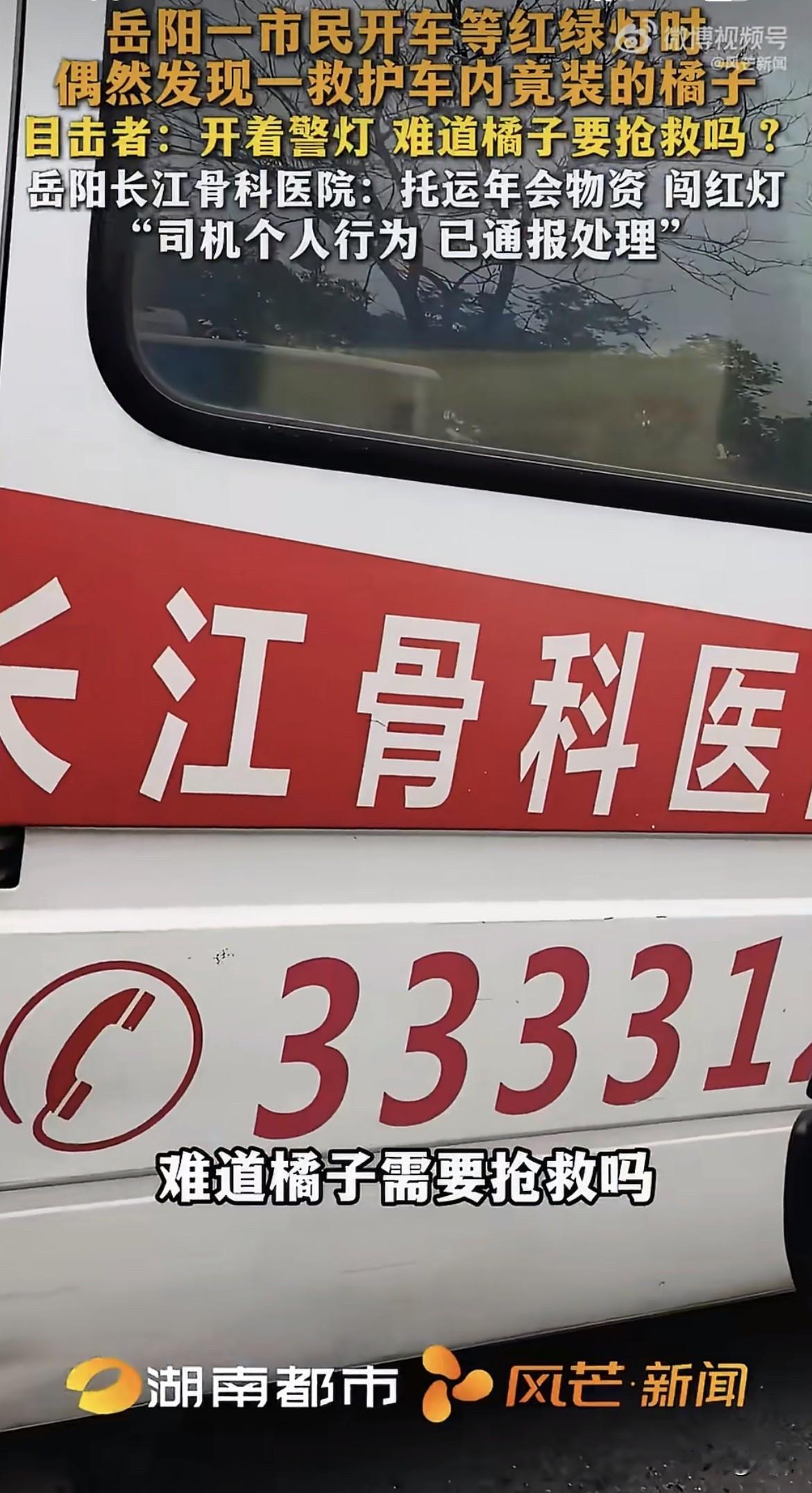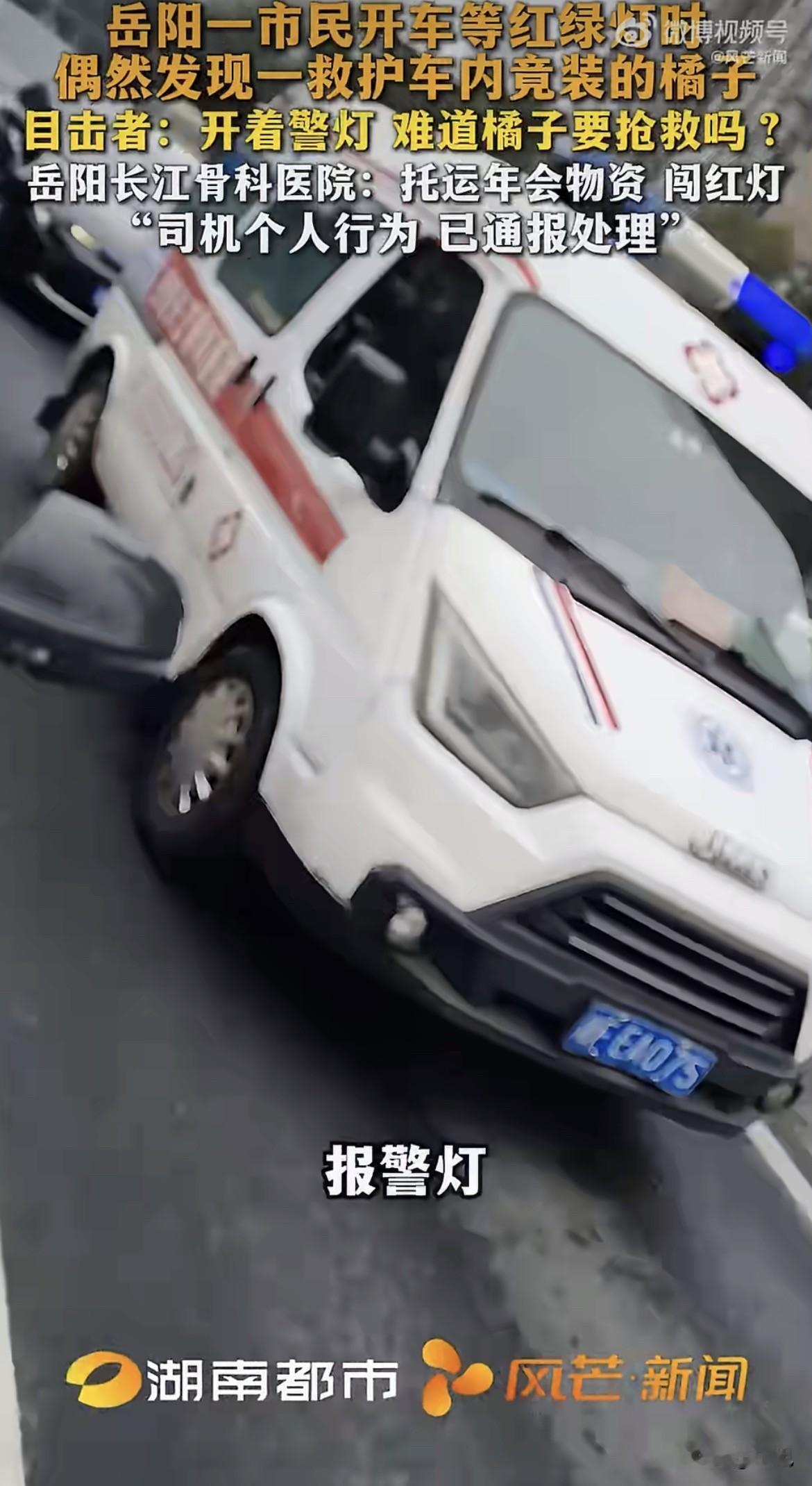 好家伙,一辆救护车,顶灯闪得跟真的似的,后车厢门大开,满满当当塞的全是黄澄澄的橘子。 拍视频的大哥当时就懵了:这是橘子要抢救,还是抢救路上的橘子? 车跑得挺快,路口红灯压根没停,踩着警笛的声儿就窜过去了。 2月10号,湖南岳阳街头,这一幕被路人拍下来发网上,炸锅了。 大家第一反应都一样:救护车什么时候变成货拉拉了? 更刺眼的是那盏警灯。它不是装饰品,是《道路交通安全法》第53条写的特权,前提只有四个字:执行紧急任务。 拉一车年会物资,算哪门子紧急? 记者找过去,医院那边回应得倒也干脆。是岳阳长江骨科医院,民营的,那辆车是院前转运的综合车。拉橘子是真的,为了托运年会物资。 闯红灯呢?医院说那是司机个人行为,已经通报处理,年终优秀员工也取消了。 一条处罚,两句话,好像这事就翻篇了。 但路人不买账。你把这车橘子换成急救设备,换成一张担架,换成任何一样跟救命沾边的东西,那盏警灯都亮得理直气壮。 可惜不是。 老百姓平时听见救护车鸣笛,第一反应是看后视镜、打方向盘、往边上靠。这是给生命让路,不是给橘子让路,更不是给某个单位的年会KPI让路。 法律上说得很清楚,特种车辆的特权只在执行紧急任务时才生效。非紧急任务闯红灯,跟私家车一样,记6分,罚200块。 司机没了优秀员工奖,但这6分扣没扣,通报里没提。 更让人膈应的是那辆车的身份。车身上印着医院名字,警灯装在车顶,老百姓分不清它是急救车还是综合车,只知道它长着救护车的样子。 信任这东西,装上去很难,卸下来很快。 今天能用它拉橘子,明天就能用它拉桌椅,后天是不是还能给哪个亲戚搬家拉个沙发? 等哪天真有一辆闪着灯、鸣着笛的救护车卡在车流里,旁边的司机心里犯嘀咕:这回拉的到底是病人,还是又一批年会奖品? 那时候再想解释,怕是已经没人信了。 这事说大不大,没出事故,没耽误救人。可说小也真不小,它把“特权”两个字摆在街面上,当成了便利贴。 你怎么看?这种开着警灯办私事的情况,罚司机一个人够不够?